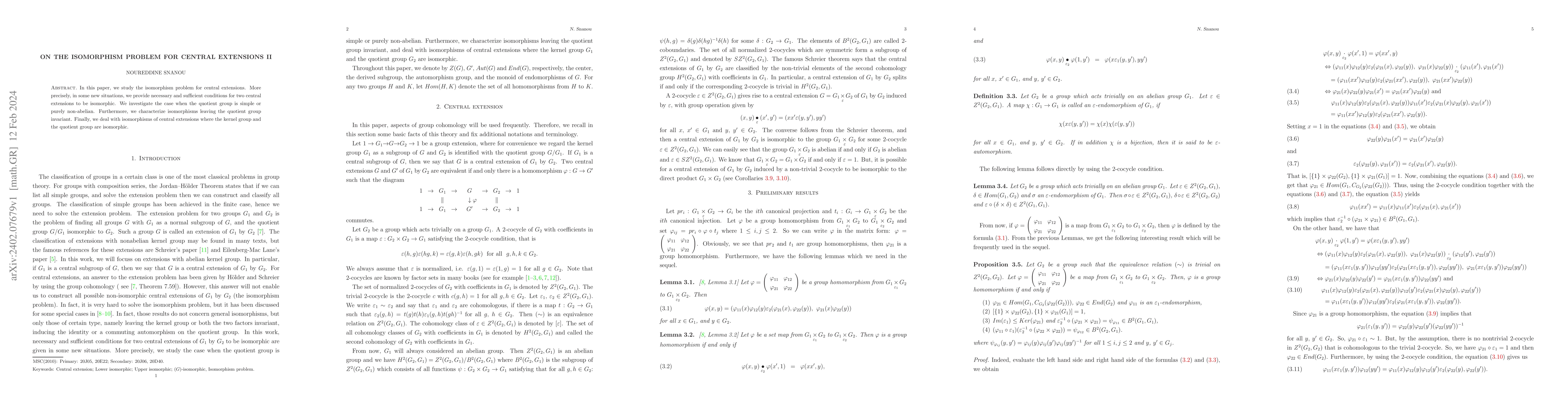 This paper addresses the isomorphism problem for central extensions, providing necessary and sufficient conditions for their isomorphism under specific conditions, including when the quotient group is simple or purely non-abelian, and characterizing invariant isomorphisms. It also explores cases where both the kernel and quotient groups are isomorphic.