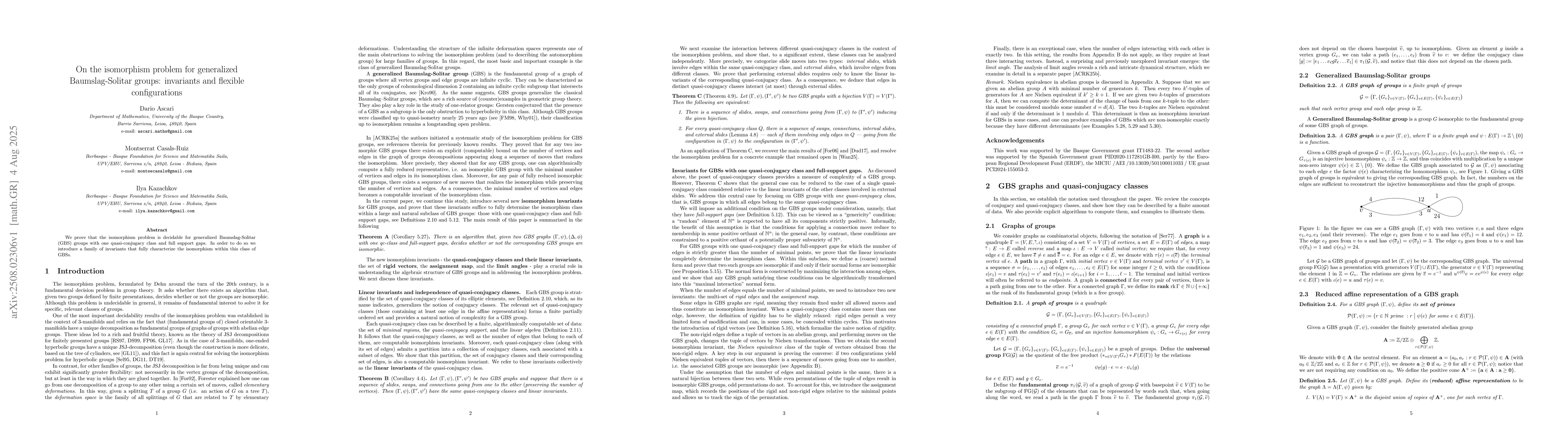 The paper proves the isomorphism problem for certain generalized Baumslag-Solitar groups decidable, introducing a set of invariants for one quasi-conjugacy class with full support gaps. This breakthrough aids in distinguishing non-isomorphic groups within this GBS class.