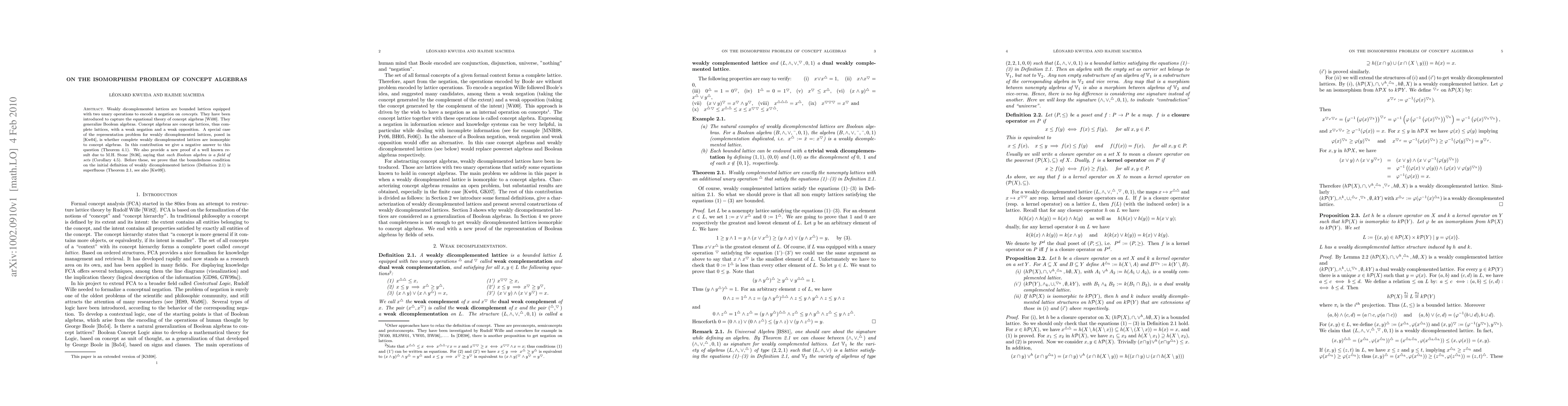 This paper addresses the isomorphism problem of concept algebras, showing that complete weakly dicomplemented lattices (wdl) are not isomorphic to concept algebras (Theorem \ref{T:main}). Additionally, it provides a new proof for the Stone theorem that every Boolean algebra is a field of sets (Corollary \ref{C:Stone}).