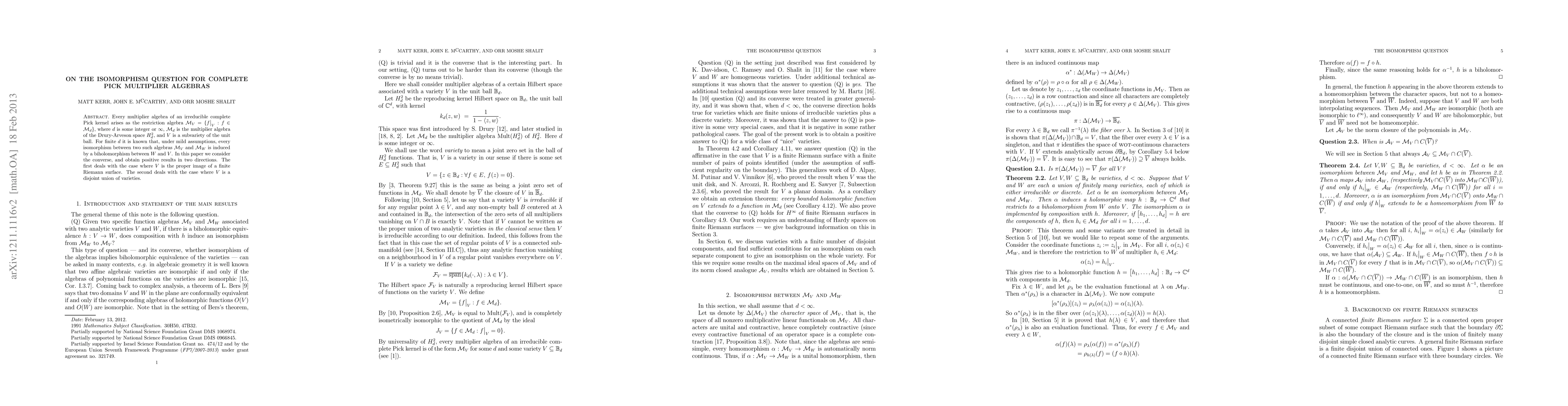 This paper investigates the isomorphism question for complete Pick multiplier algebras, showing that isomorphisms between such algebras arise from biholomorphisms when $V$ is the proper image of a finite Riemann surface or a disjoint union of varieties. The results extend known findings for finite dimensions to these more complex cases.