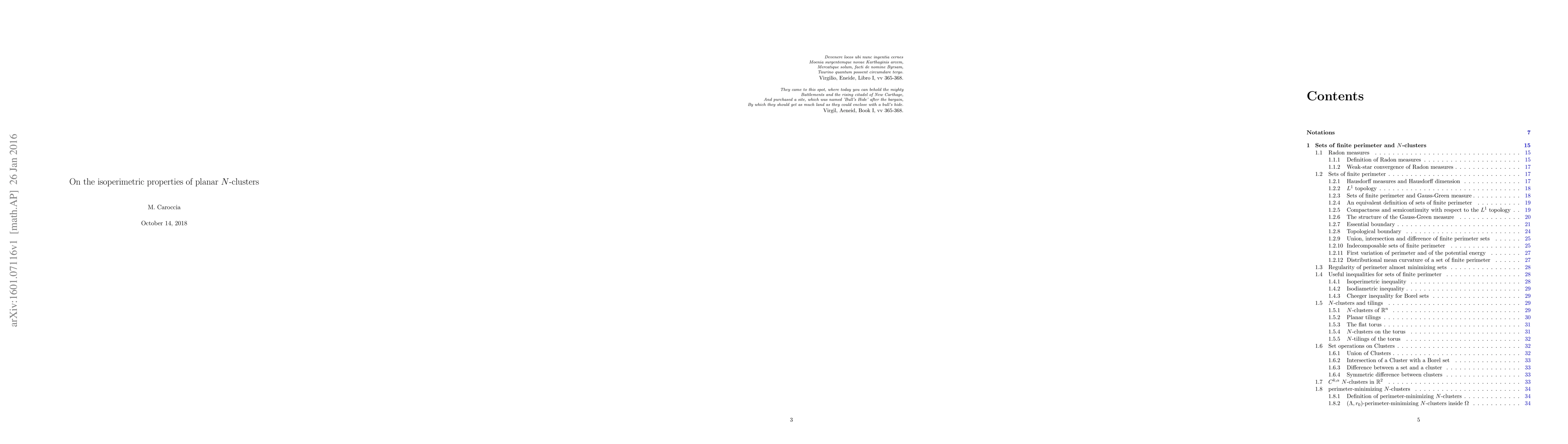 This Thesis aims to highlight some isoperimetric questions involving the, so-called, $N$-clusters. We first briefly recall the theoretical framework we are adopting. This is done in Chapter one. In chapter two we focus on the standard isoperimetric problem for planar $N$-cluster for large values of $N$ and we provide an equidistribution energy-type results under some suitable assumption. The third Chapter is devoted to a stability results of the hexagonal honeycomb tiling. Finally in the fourth Chapter we consider a generalization of the Cheeger constant, defined as a minimization of a suitable energy among the class of the $N$-clusters. We show how this problem is related to the optimal partition problem for the first Dirichlet eigenvalue of the Laplacian introduced by Caffarelli and Fang-Hua Lin in 2007. We conclude, in Chapter five, with some remarks and some possible future direction of investigation.