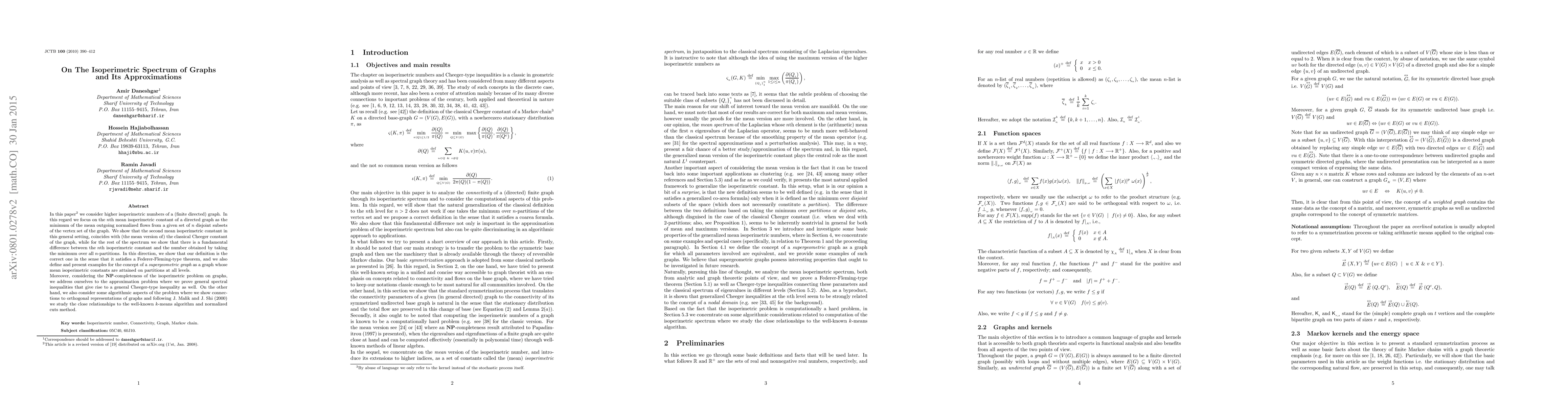 In this paper we consider higher isoperimetric numbers of a (finite directed) graph. In this regard we focus on the $n$th mean isoperimetric constant of a directed graph as the minimum of the mean outgoing normalized flows from a given set of $n$ disjoint subsets of the vertex set of the graph. We show that the second mean isoperimetric constant in this general setting, coincides with (the mean version of) the classical Cheeger constant of the graph, while for the rest of the spectrum we show that there is a fundamental difference between the $n$th isoperimetric constant and the number obtained by taking the minimum over all $n$-partitions. In this direction, we show that our definition is the correct one in the sense that it satisfies a Federer-Fleming-type theorem, and we also define and present examples for the concept of a supergeometric graph as a graph whose mean isoperimetric constants are attained on partitions at all levels. Moreover, considering the ${\bf NP}$-completeness of the isoperimetric problem on graphs, we address ourselves to the approximation problem where we prove general spectral inequalities that give rise to a general Cheeger-type inequality as well. On the other hand, we also consider some algorithmic aspects of the problem where we show connections to orthogonal representations of graphs and following J.~Malik and J.~Shi ($2000$) we study the close relationships to the well-known $k$-means algorithm and normalized cuts method.