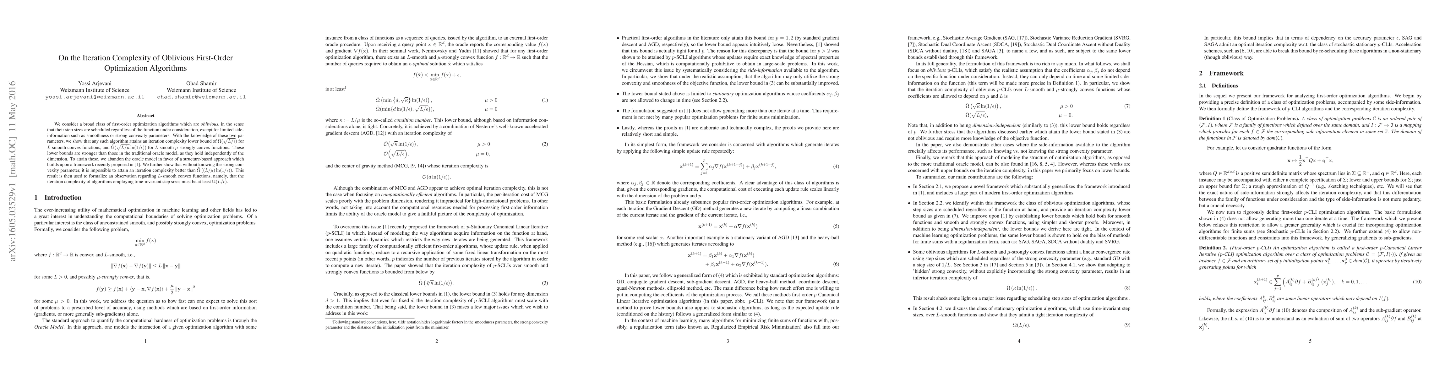 We consider a broad class of first-order optimization algorithms which are \emph{oblivious}, in the sense that their step sizes are scheduled regardless of the function under consideration, except for limited side-information such as smoothness or strong convexity parameters. With the knowledge of these two parameters, we show that any such algorithm attains an iteration complexity lower bound of $\Omega(\sqrt{L/\epsilon})$ for $L$-smooth convex functions, and $\tilde{\Omega}(\sqrt{L/\mu}\ln(1/\epsilon))$ for $L$-smooth $\mu$-strongly convex functions. These lower bounds are stronger than those in the traditional oracle model, as they hold independently of the dimension. To attain these, we abandon the oracle model in favor of a structure-based approach which builds upon a framework recently proposed in (Arjevani et al., 2015). We further show that without knowing the strong convexity parameter, it is impossible to attain an iteration complexity better than $\tilde{\Omega}\left((L/\mu)\ln(1/\epsilon)\right)$. This result is then used to formalize an observation regarding $L$-smooth convex functions, namely, that the iteration complexity of algorithms employing time-invariant step sizes must be at least $\Omega(L/\epsilon)$.