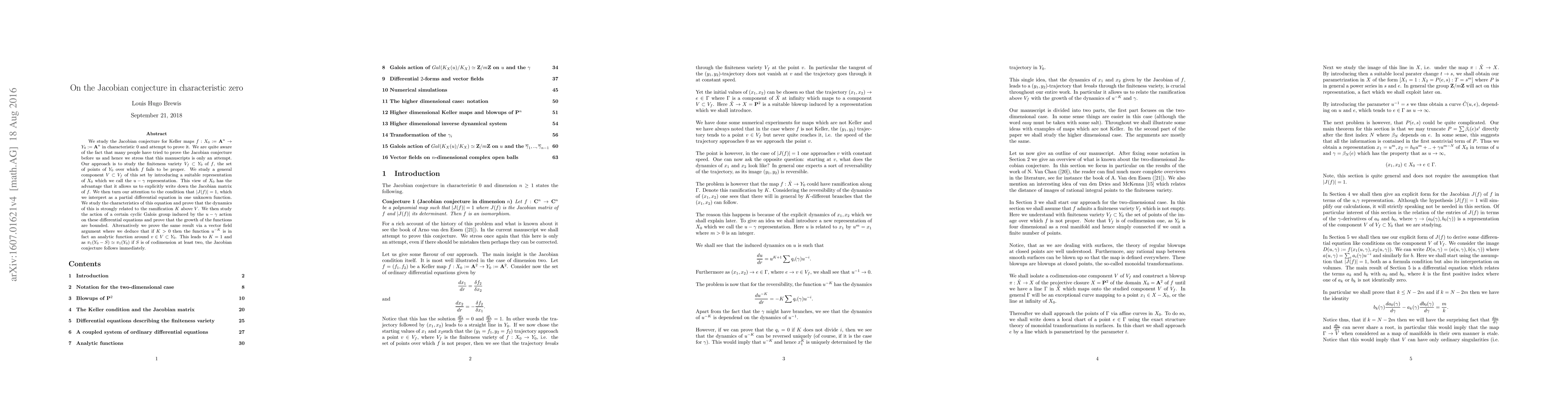 We study the Jacobian conjecture for Keller maps $f:X_0:=\mathbf{A}^n\rightarrow Y_0:=\mathbf{A}^n$ in characteristic $0$ and attempt to prove it. We are quite aware of the fact that many people have tried to prove the Jacobian conjecture before us and hence we stress that this manuscripts is only an attempt. Our approach is to study the finiteness variety $V_f \subset Y_0$ of $f$, the set of points of $Y_0$ over which $f$ fails to be proper. We study a general component $V \subset V_f$ of this set by introducing a suitable representation of $X_0$ which we call the $u-\gamma$ representation. This view of $X_0$ has the advantage that it allows us to explicitly write down the Jacobian matrix of $f$. We then turn our attention to the condition that $|J(f)| = 1$, which we interpret as a partial differential equation in one unknown function. We study the characteristics of this equation and prove that the dynamics of this is strongly related to the ramification $K$ above $V$. We then study the action of a certain cyclic Galois group induced by the $u-\gamma$ action on these differential equations and prove that the growth of the functions are bounded. Alternatively we prove the same result via a vector field argument where we deduce that if $K > 0$ then the function $u^{-K}$ is in fact an analytic function around $v \in V \subset Y_0$. This leads to $K = 1$ and as $\pi_1(Y_0 - S) \simeq \pi_1(Y_0)$ if $S$ is of codimension at least two, the Jacobian conjecture follows immediately.
