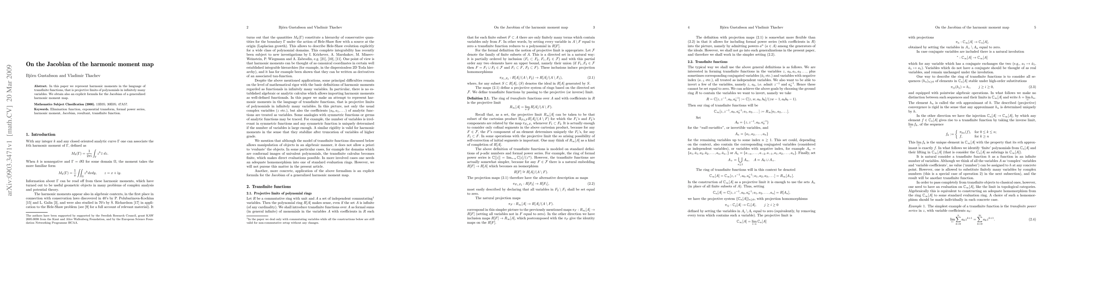 In this paper we represent harmonic moments in the language of transfinite functions, that is projective limits of polynomials in infinitely many variables. We obtain also an explicit formula for the Jacobian of a generalized harmonic moment map.