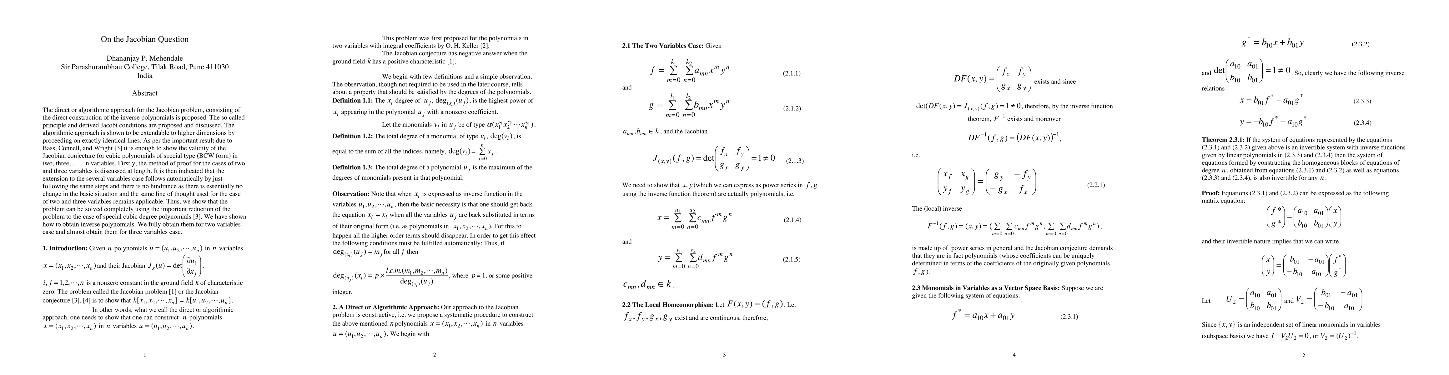 The direct or algorithmic approach for the Jacobian problem, consisting of the direct construction of the inverse polynomials is proposed. The so called principle and derived Jacobi conditions are proposed and discussed. The algorithmic approach is shown to be extendable to higher dimensions by proceeding on exactly identical lines. As per the important result due to Bass, Connell, and Wright [3] it is enough to show the validity of the Jacobian conjecture for cubic polynomials of special type (BCW form) in two, three, and n variables. Firstly, the method of proof for the cases of two and three variables is discussed at length. It is then indicated that the extension to the several variables case follows automatically by just following the same steps and there is no hindrance as there is essentially no change in the basic situation and the same line of thought used for the case of two and three variables remains applicable. Thus, we show that the problem can be solved completely using the important reduction of the problem to the case of special cubic degree polynomials [3]. We have shown how to obtain inverse polynomials. We fully obtain them for two variables case and almost obtain them for three variables case.