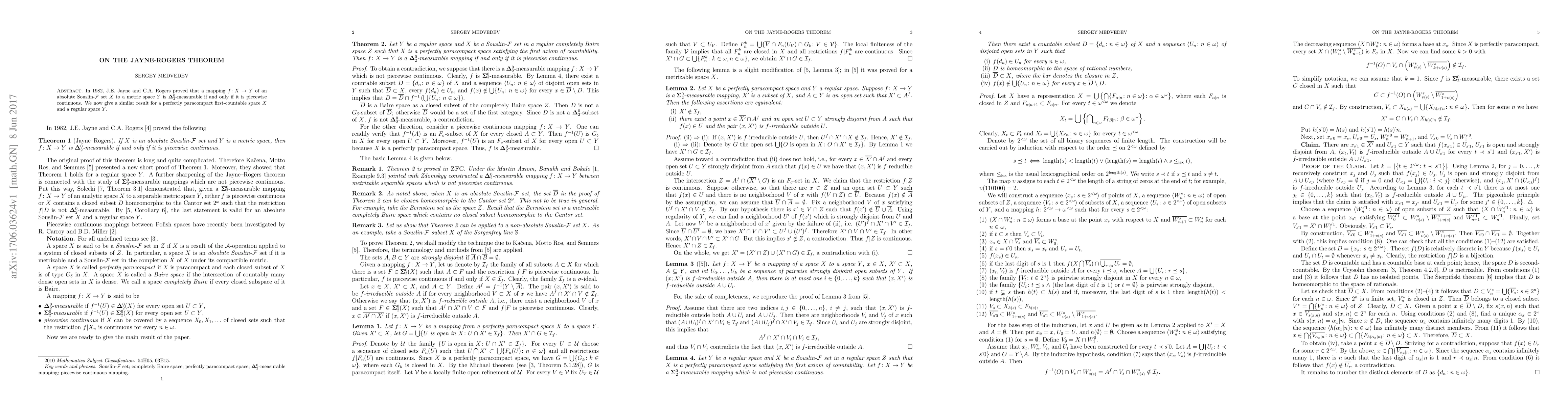 In 1982, J.E. Jayne and C.A. Rogers proved that a mapping $f \colon X \rightarrow Y$ of an absolute Souslin-F set X to a metric space Y is $\Delta^0_2$-measurable if and only if it is piecewise continuous. We now give a similar result for a perfectly paracompact first-countable space X and a regular space Y.