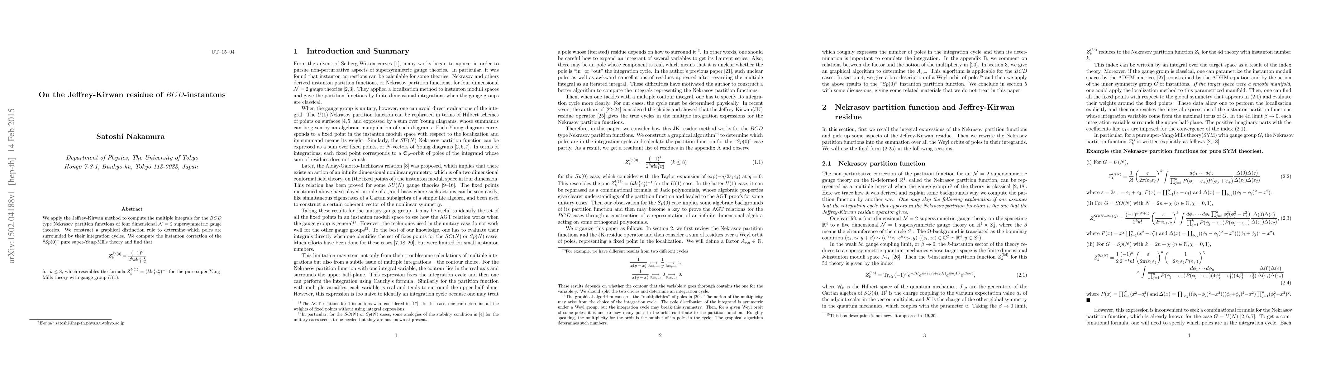 This paper uses the Jeffrey-Kirwan method to calculate BCD-instanton partition functions in four-dimensional $mathcal{N}=2$ supersymmetric gauge theories. A graphical rule identifies poles encircled by integration cycles, leading to the instanton correction formula for 'Sp(0)' pure super-Yang-Mills theory, $Z^{Sp(0)}_{k}=(-1)^{k}(2^{k}k!varepsilon_{1}^{k}varepsilon_{2}^{k})^{-1}$ for $kle 8$. This resembles the U(1) gauge group pure super-Yang-Mills theory formula, $Z^{U(1)}_{k}=(k!varepsilon_{1}^{k}varepsilon_{2}^{k})^{-1}$.
