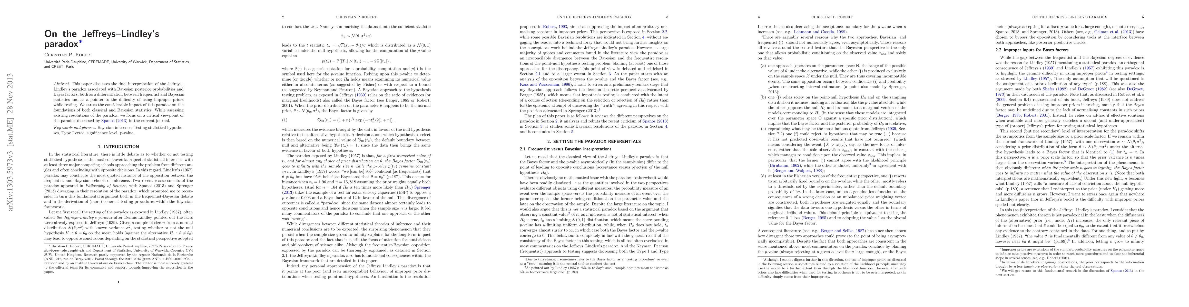 This paper discusses the dual interpretation of the Jeffreys--Lindley's paradox associated with Bayesian posterior probabilities and Bayes factors, both as a differentiation between frequentist and Bayesian statistics and as a pointer to the difficulty of using improper priors while testing. We stress the considerable impact of this paradox on the foundations of both classical and Bayesian statistics. While assessing existing resolutions of the paradox, we focus on a critical viewpoint of the paradox discussed by Spanos (2013) in Philosophy of Science.