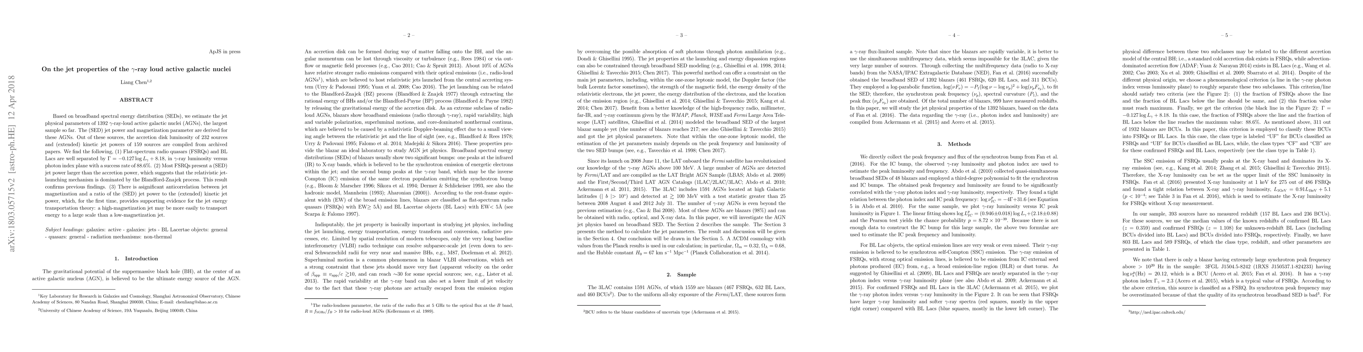 Based on broadband spectral energy distribution (SEDs), we estimate the jet physical parameters of 1392 $\gamma$-ray-loud active galactic nuclei (AGNs), the largest sample so far. The (SED) jet power and magnetization parameter are derived for these AGNs. Out of these sources, the accretion disk luminosity of 232 sources and (extended) kinetic jet powers of 159 sources are compiled from archived papers. We find the following, (1) Flat-spectrum radio quasars (FSRQs) and BL Lacs are well separated by $\Gamma=-0.127\log L_{\gamma}+8.18$, in $\gamma$-ray luminosity versus photon index plane with a success rate of 88.6\%. (2) Most FSRQs present a (SED) jet power larger than the accretion power, which suggests that the relativistic jet-launching mechanism is dominated by the Blandford-Znajek process. This result confirms previous findings. (3) There is asignificant anticorrelation between jet magnetization and a ratio of the (SED) jet power to the (extended) kinetic jet power, which, for the first time, provides supporting evidence for the jet energy transportation theory: a high-magnetization jet may be more easily to transport energy to a large scale than a low-magnetization jet.