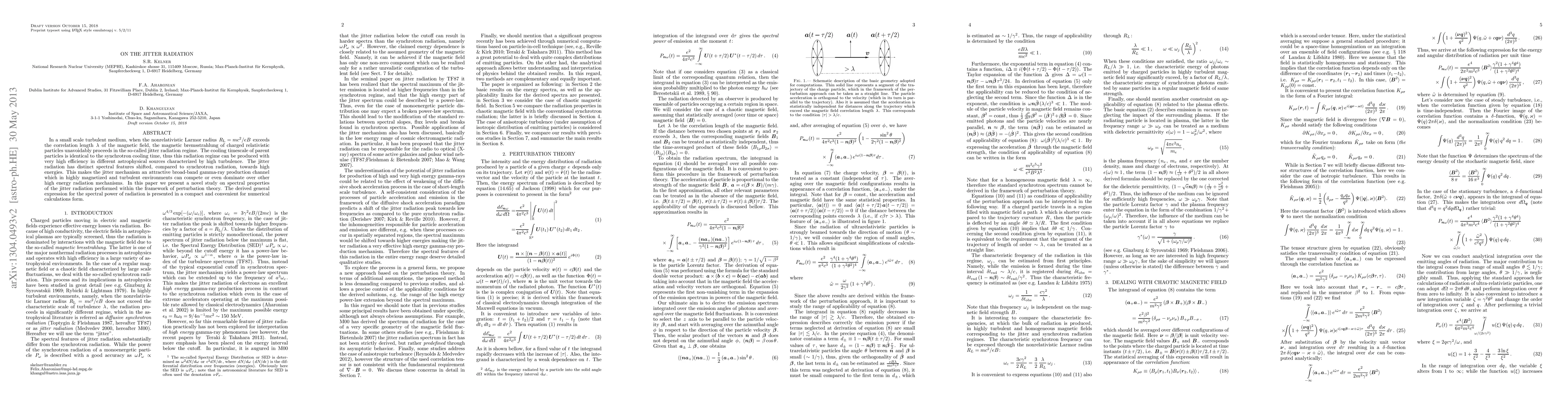 In a small scale turbulent medium, when the nonrelativistic Larmor radius $R_{\rm L}=mc^2/eB$ exceeds the correlation length $\lambda$ of the magnetic field, the magnetic bremsstrahlung of charged relativistic particles unavoidably proceeds in the so-called jitter radiation regime. The cooling timescale of parent particles is identical to the synchrotron cooling time, thus this radiation regime can be produced with very high efficiency in different astrophysical sources characterized by high turbulence. The jitter radiation has distinct spectral features shifted, compared to synchrotron radiation, towards high energies. This makes the jitter mechanism an attractive broad-band gamma-ray production channel which in highly magnetized and turbulent environments can compete or even dominate over other high energy radiation mechanisms. In this paper we present a novel study on spectral properties of the jitter radiation performed within the framework of perturbation theory. The derived general expression for the spectral power of radiation is presented in a compact and convenient for numerical calculations form.