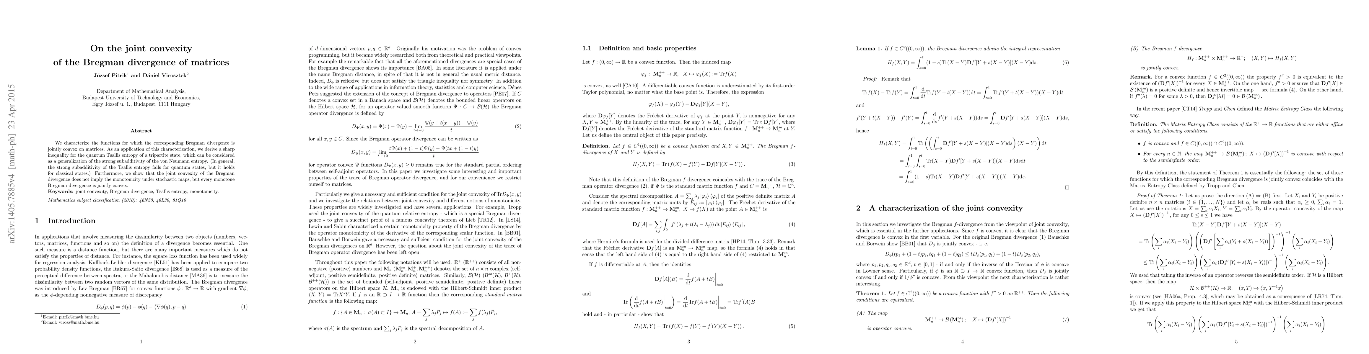 This paper characterizes functions for which the Bregman divergence is jointly convex on matrices, leading to a sharp inequality for the quantum Tsallis entropy of tripartite states. It also clarifies that joint convexity does not imply monotonicity under stochastic maps, but monotone Bregman divergences are jointly convex.
