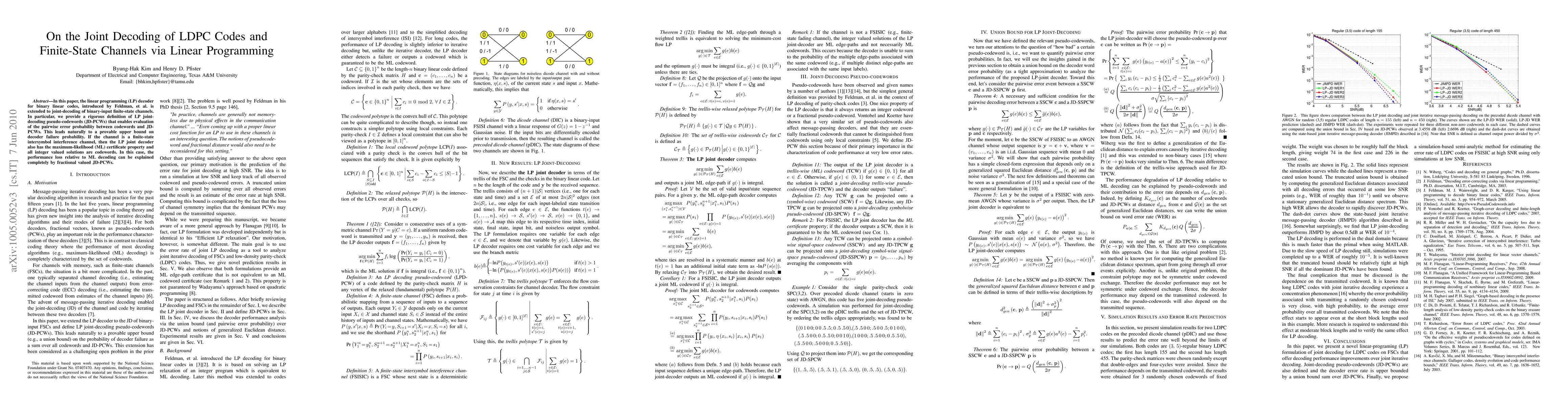 This paper extends linear programming (LP) decoding for binary linear codes to joint-decoding with finite-state channels, introducing LP joint-decoding pseudo-codewords (JD-PCWs) for evaluating error probabilities. It provides a provable upper bound on decoder failure probability and shows that for finite-state intersymbol interference channels, LP joint decoding has maximum-likelihood properties, with performance loss attributed to fractional JD-PCWs.
