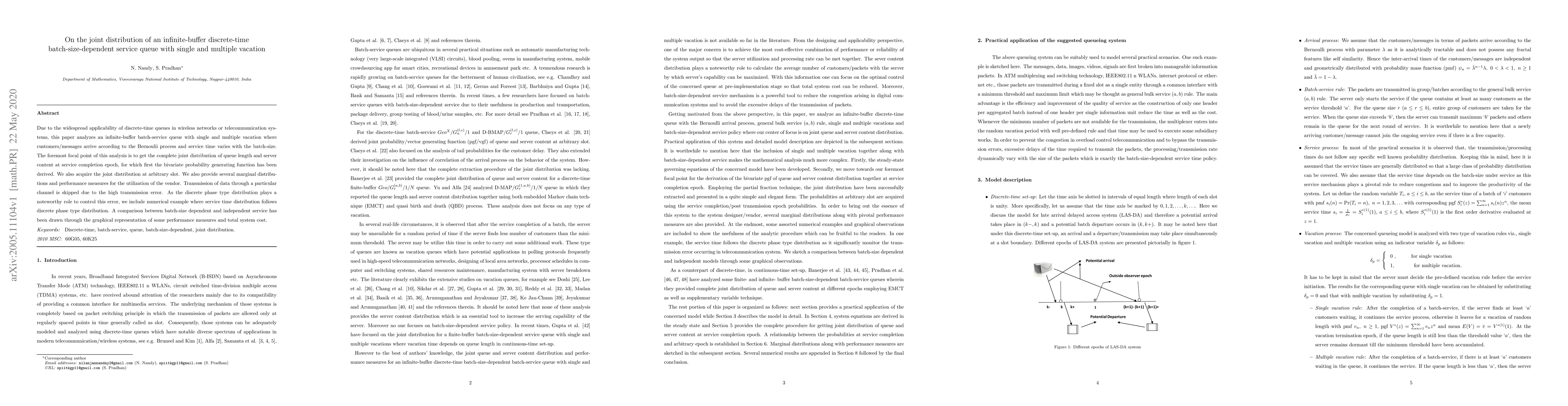 Due to the widespread applicability of discrete-time queues in wireless networks or telecommunication systems, this paper analyzes an infinite-buffer batch-service queue with single and multiple vacation where customers/messages arrive according to the Bernoulii process and service time varies with the batch-size. The foremost focal point of this analysis is to get the complete joint distribution of queue length and server content at service completion epoch, for which first the bivariate probability generating function has been derived. We also acquire the joint distribution at arbitrary slot. We also provide several marginal distributions and performance measures for the utilization of the vendor. Transmission of data through a particular channel is skipped due to the high transmission error. As the discrete phase type distribution plays a noteworthy role to control this error, we include numerical example where service time distribution follows discrete phase type distribution. A comparison between batch-size dependent and independent service has been drawn through the graphical representation of some performance measures and total system cost.