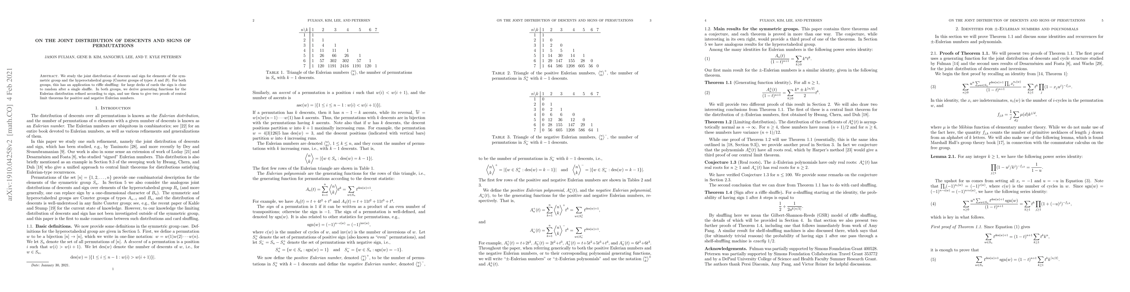 This paper investigates the joint distribution of descents and signs in permutations of symmetric and hyperoctahedral groups, deriving generating functions for refined Eulerian distributions and providing proofs for central limit theorems regarding positive and negative Eulerian numbers, with applications to riffle shuffling.