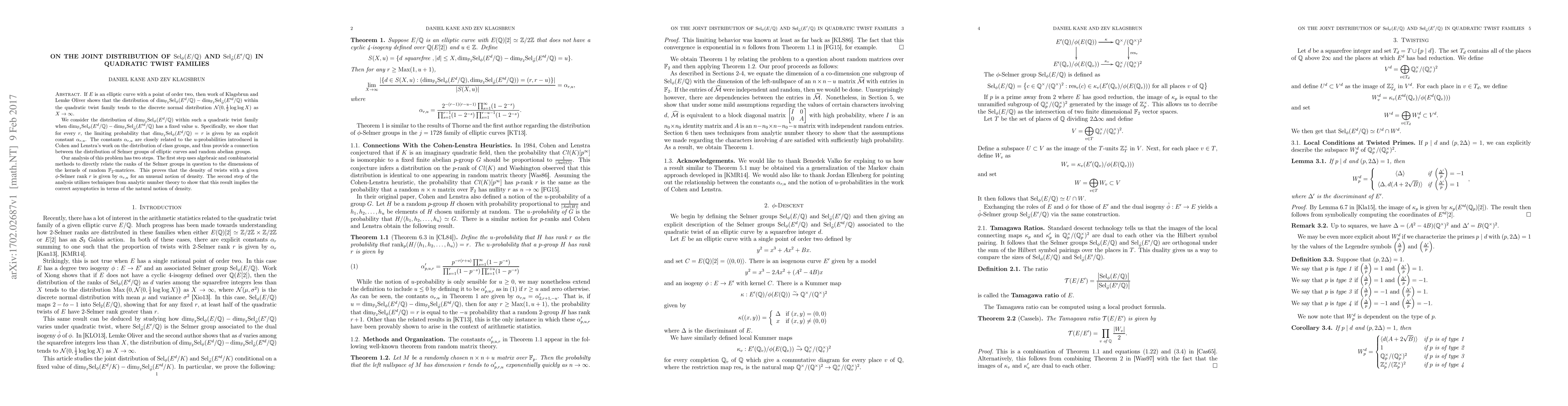 This paper explores the joint distribution of Selmer groups for elliptic curves within quadratic twist families, showing that the distribution of their dimensions tends to a discrete normal distribution. It establishes explicit constants $\alpha_{r,u}$ for the limiting probabilities of specific Selmer group dimensions, linking the results to Cohen and Lenstra's $u$-probabilities and providing a connection between elliptic curve Selmer groups and random abelian groups.