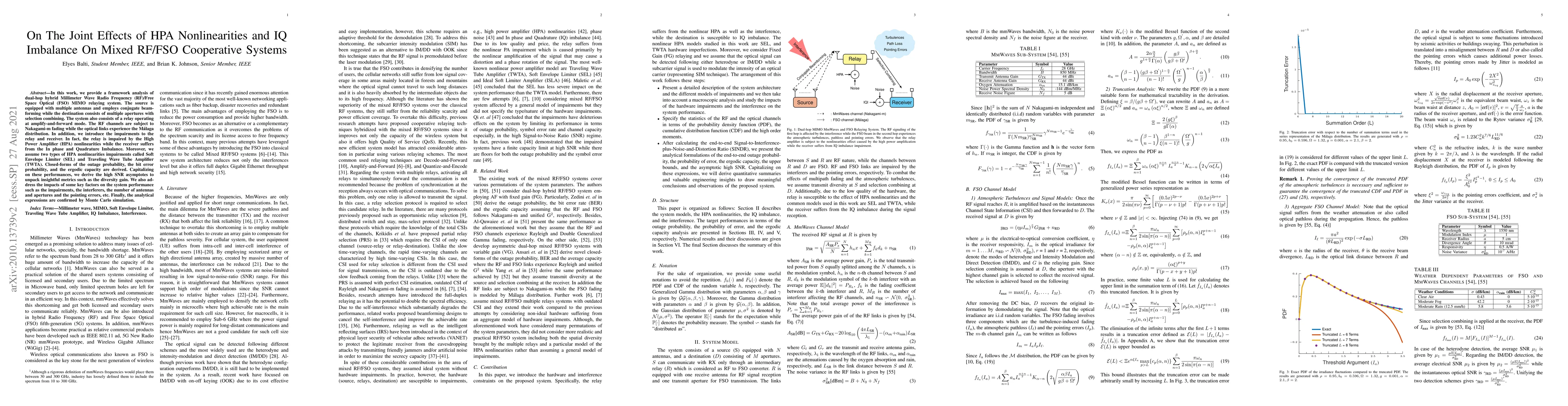 In this work, we provide a framework analysis of dual-hop hybrid Millimeter Wave Radio Frequency (RF)/Free Space Optical (FSO) MIMO relaying system. The source is equipped with multiple antennas and employs conjugate beamforming while the destination consists of multiple apertures with selection combining. The system also consists of a relay operating at amplify-and-forward mode. The RF channels are subject to Nakagami-m fading while the optical links experience the M\'alaga distribution. In addition, we introduce the impairments to the relay and receiver. In fact, the relay is impaired by the High Power Amplifier (HPA) nonlinearities while the receiver suffers from the In phase and Quadrature Imbalance. Moreover, we assume two types of HPA nonlinearities impairments called Soft Envelope Limiter (SEL) and Traveling Wave Tube Amplifier (TWTA). Closed-forms of the outage probability, the bit error probability, and the ergodic capacity are derived. Capitalizing on these performances, we derive the high SNR asymptotes to unpack insightful metrics such as the diversity gain. We also address the impacts of some key factors on the system performance such as the impairments, the interferers, the number of antennas and apertures and the pointing errors, etc. Finally, the analytical expressions are confirmed by Monte Carlo simulation.