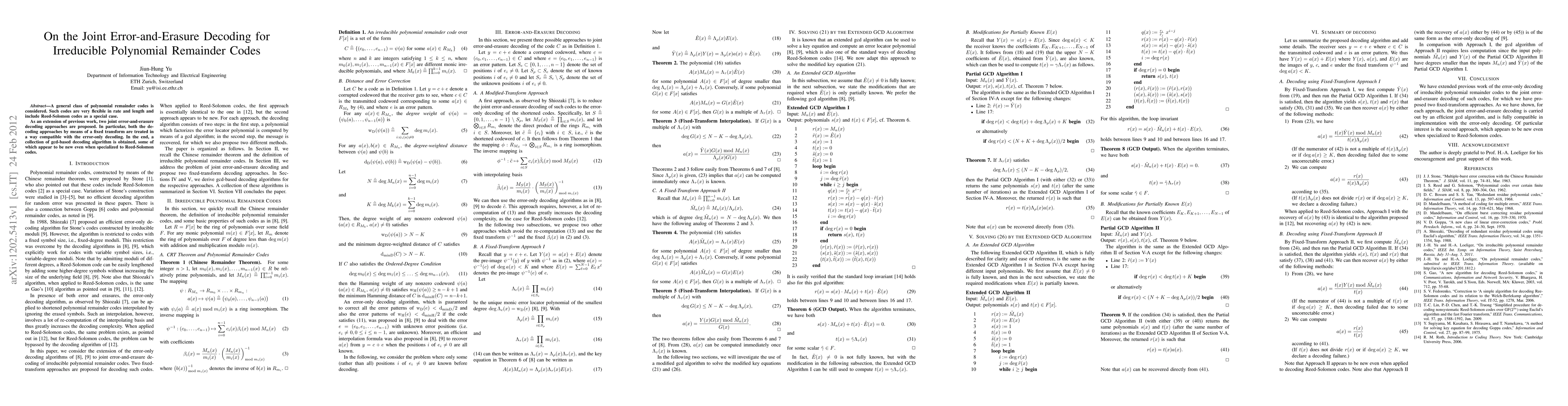 This paper proposes two joint error-and-erasure decoding methods for irreducible polynomial remainder codes, which include Reed-Solomon codes. The approaches utilize fixed transforms compatible with error-only decoding and result in a set of novel gcd-based decoding algorithms.