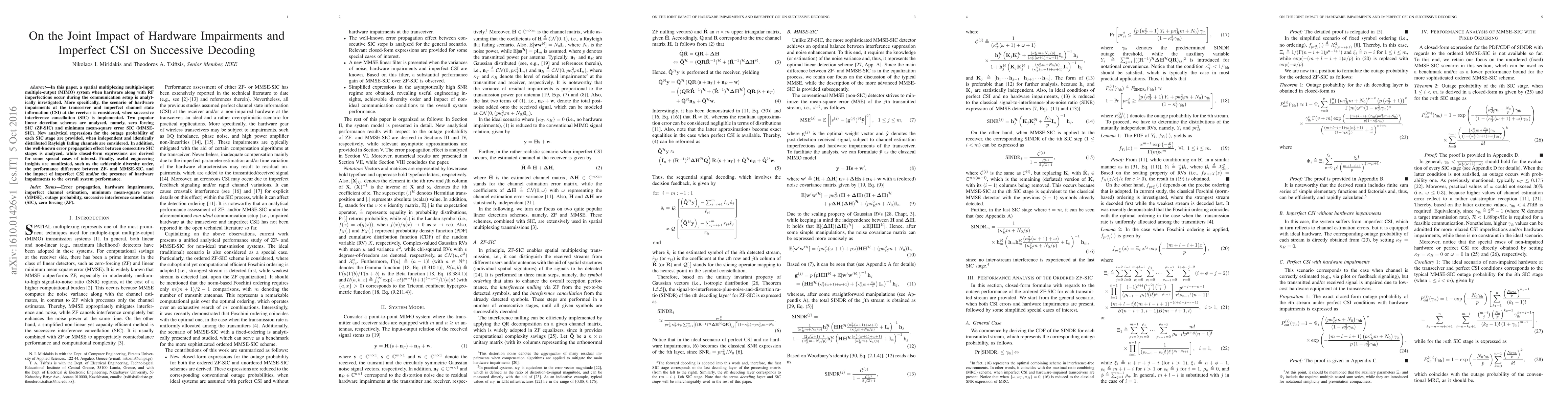 In this paper, a spatial multiplexing multiple-input multiple-output (MIMO) system when hardware along with RF imperfections occur during the communication setup is analytically investigated. More specifically, the scenario of hardware impairments at the transceiver and imperfect channel state information (CSI) at the receiver is considered, when successive interference cancellation (SIC) is implemented. Two popular linear detection schemes are analyzed, namely, zero forcing SIC (ZF-SIC) and minimum mean-square error SIC (MMSE-SIC). New analytical expressions for the outage probability of each SIC stage are provided, when independent and identically distributed Rayleigh fading channels are considered. In addition, the well-known error propagation effect between consecutive SIC stages is analyzed, while closed-form expressions are derived for some special cases of interest. Finally, useful engineering insights are manifested, such as the achievable diversity order, the performance difference between ZF- and MMSE-SIC, and the impact of imperfect CSI and/or the presence of hardware impairments to the overall system performance.