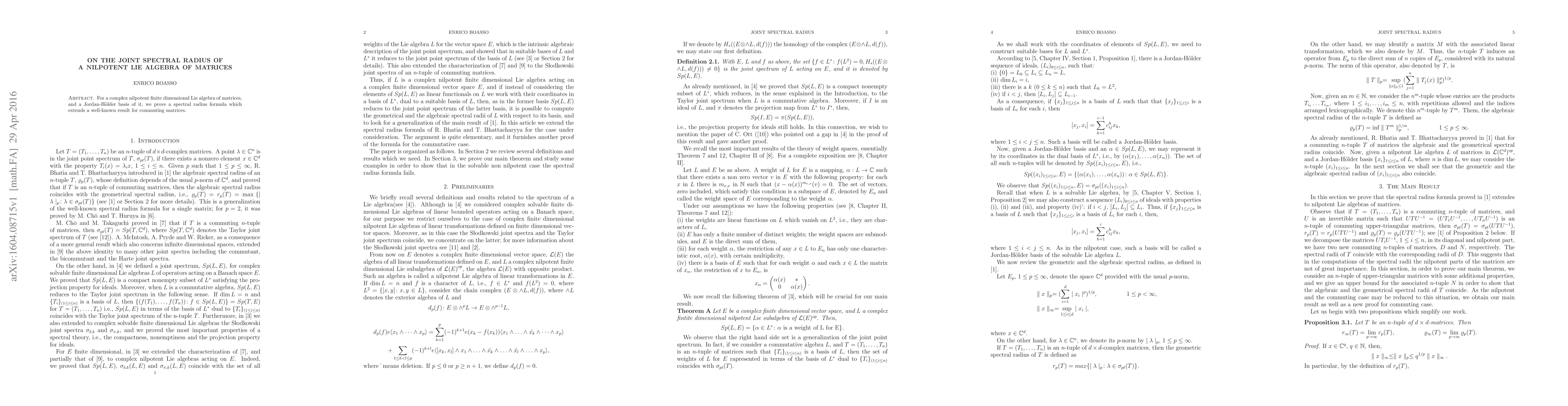 For a complex nilpotent finite dimensional Lie algebra of matrices,and a Jordan-H\"older basis of it, we prove a spectral radius formula which extends a well-known result for commuting matrices.