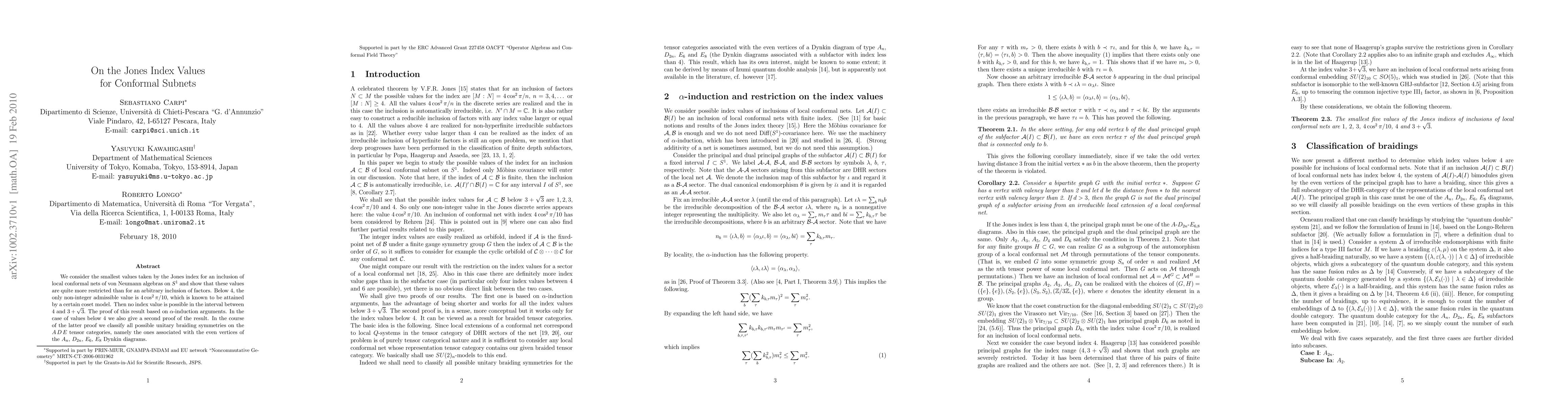 Researchers show that Jones index values for conformal subnets on S^1 have restricted values below 4, with no possible integer values between 3 and 3 +√3, and a specific value of 4∞cos^2 π/10 attained by a coset model.