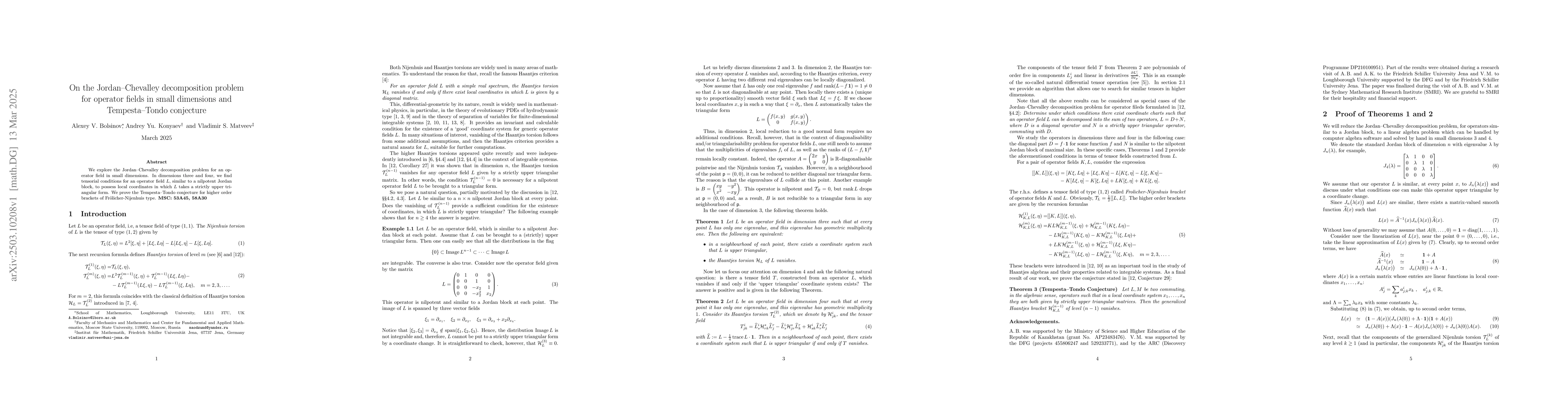 The paper presents new tensorial conditions and proves the Tempesta-Tondo conjecture, advancing knowledge in the Jordan-Chevalley decomposition problem for operator fields.