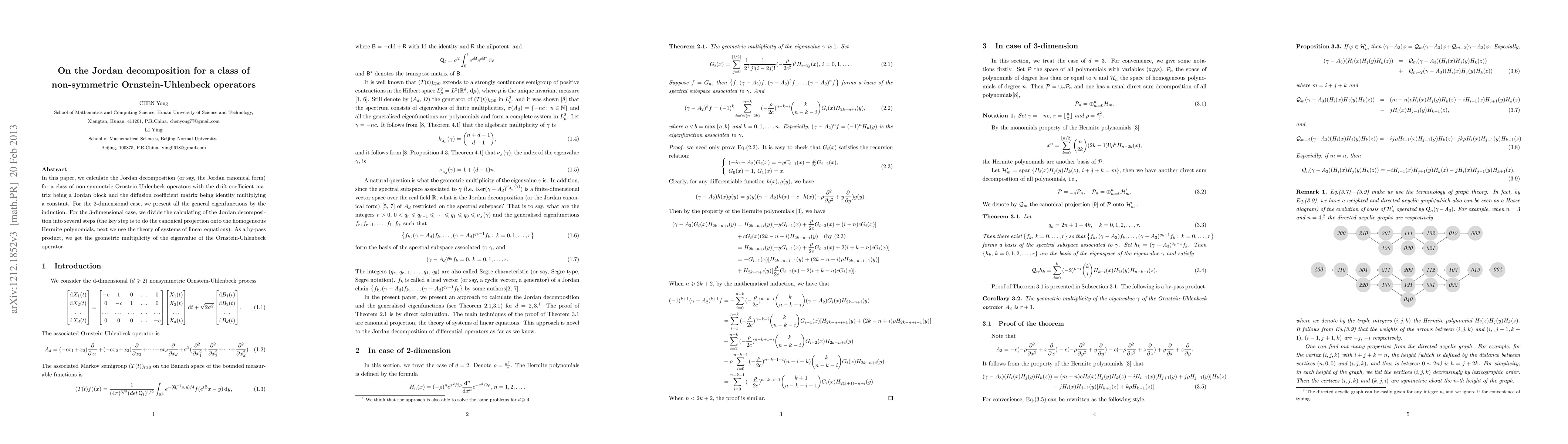 In this paper, we calculate the Jordan decomposition (or say, the Jordan canonical form) for a class of non-symmetric Ornstein-Uhlenbeck operators with the drift coefficient matrix being a Jordan block and the diffusion coefficient matrix being identity multiplying a constant. For the 2-dimensional case, we present all the general eigenfunctions by the induction. For the 3-dimensional case, we divide the calculating of the Jordan decomposition into several steps (the key step is to do the canonical projection onto the homogeneous Hermite polynomials, next we use the theory of systems of linear equations). As a by-pass product, we get the geometric multiplicity of the eigenvalue of the Ornstein-Uhlenbeck operator.