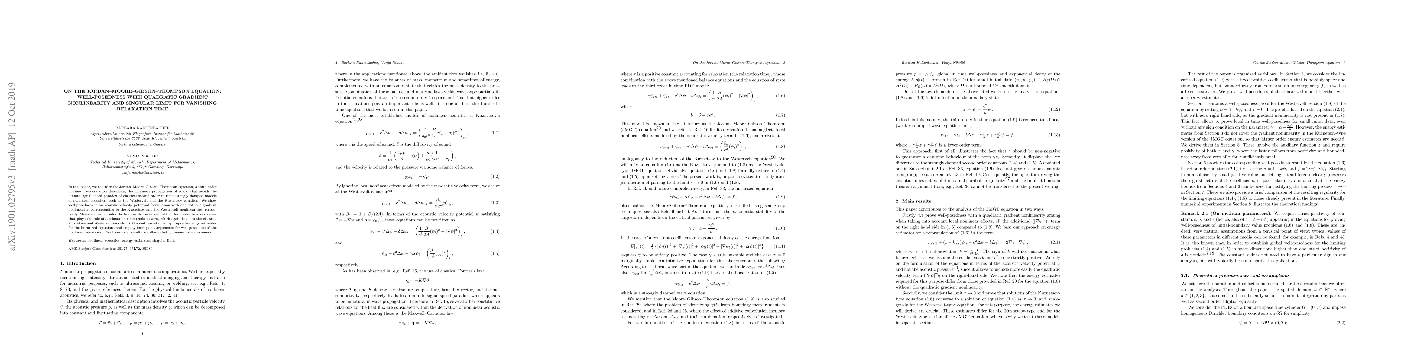 This paper establishes well-posedness for the Jordan-Moore-Gibson-Thompson equation, a third-order wave equation for nonlinear sound propagation, with and without quadratic gradient nonlinearity. It also examines the singular limit as the relaxation time parameter approaches zero, leading to classical models like the Kuznetsov and Westervelt equations.