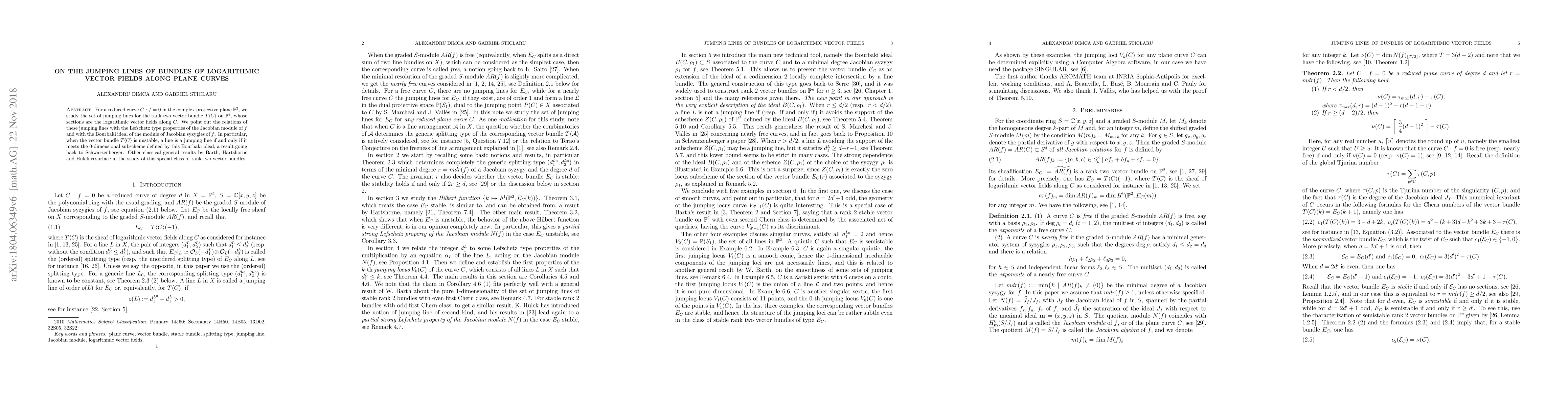 This paper investigates the jumping lines of the rank two vector bundle $T\langle C \rangle$ associated with logarithmic vector fields along a reduced plane curve $C$ in $\mathbb{P}^2$. It explores connections to Lefschetz properties and the Bourbaki ideal, revealing that a line is a jumping line if it intersects the 0-dimensional subscheme defined by the Bourbaki ideal, as noted by Schwarzenberger.