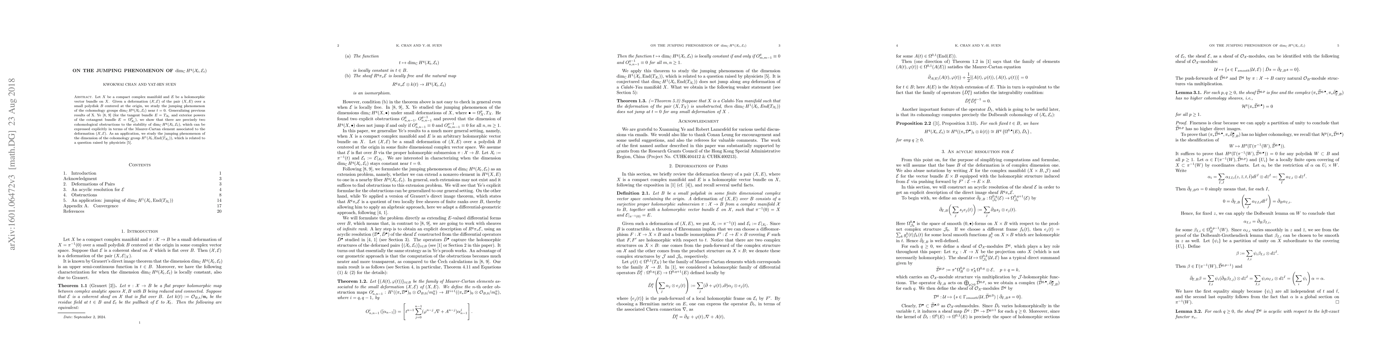 This research paper studies the jumping phenomenon of cohomology groups near t=0 for a compact complex manifold and holomorphic vector bundle, identifying two cohomological obstructions to stability with explicit expressions in terms of the Maurer-Cartan element.