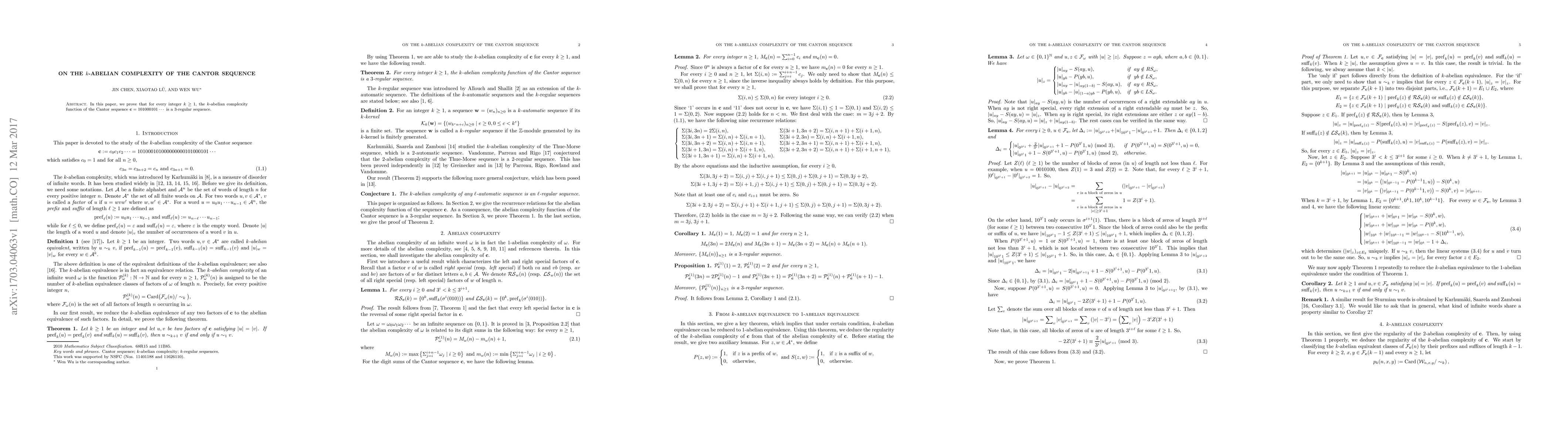 In this paper, we prove that for every integer $k \geq 1$, the $k$-abelian complexity function of the Cantor sequence $\mathbf{c} = 101000101\cdots$ is a $3$-regular sequence.