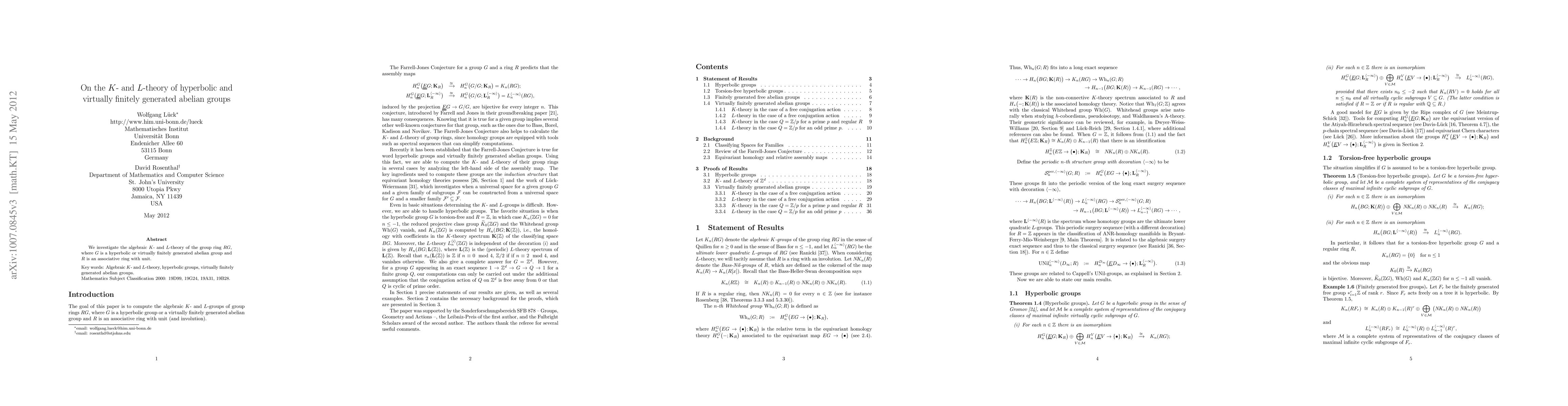 This paper explores the algebraic K- and L-theory of the group ring RG, focusing on hyperbolic and virtually finitely generated abelian groups G over an associative ring R with unit. The study aims to understand the structural properties of these group rings through K- and L-theory.