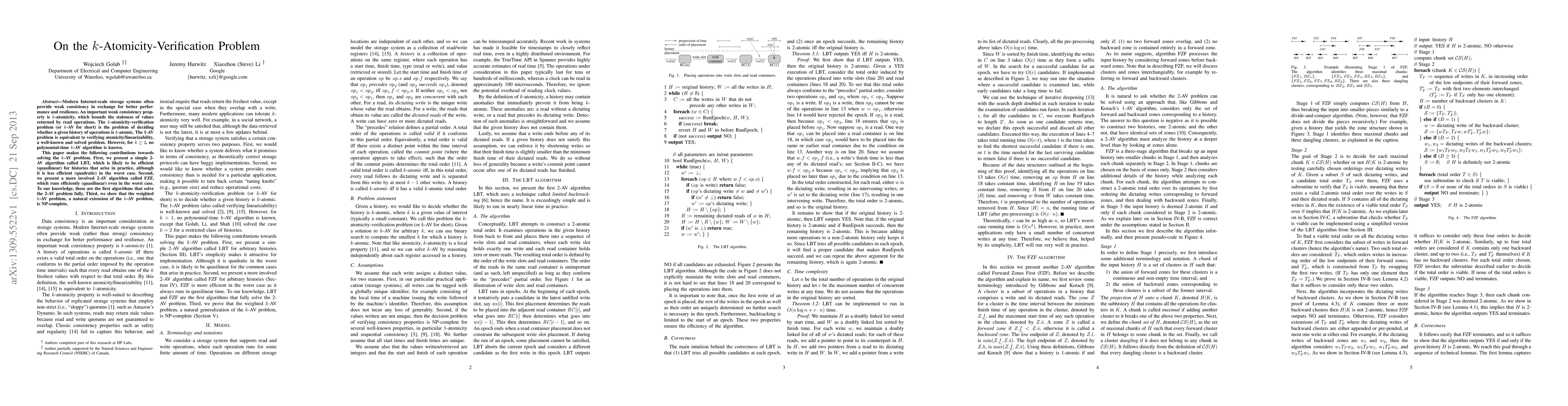 This paper introduces two algorithms, LBT and FZF, for solving the 2-atomicity-verification problem (2-AV), which is the first full solution for k-AV when k > 1. It also proves the weighted k-AV problem to be NP-complete.