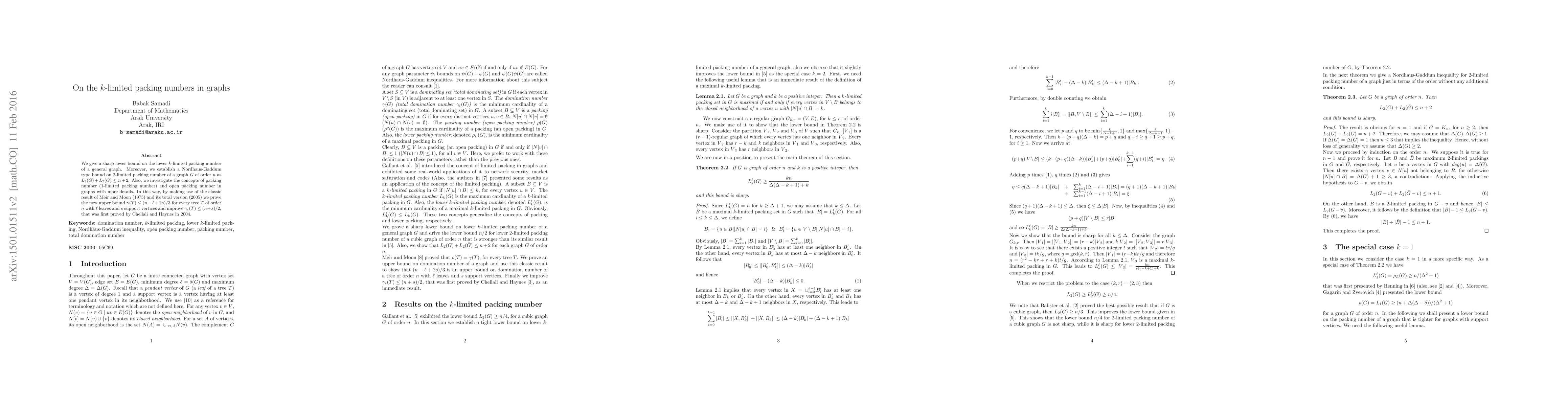 The paper provides sharp lower bounds on the lower $k$-limited packing number of a general graph, establishes a Nordhaus-Gaddum type bound on $2$-limited packing number, and investigates packing and open packing numbers in graphs with detailed analysis.