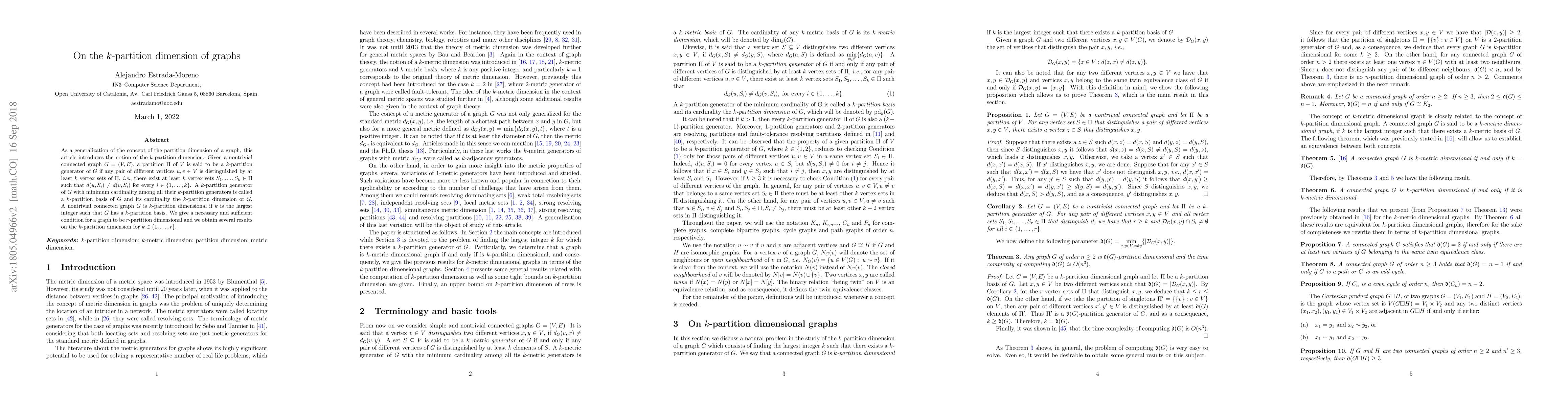This paper introduces the concept of the k-partition dimension of graphs, which is a measure of how complex it is to partition the vertices into sets that distinguish any two vertices, with varying levels of difficulty depending on the size of the set. The researchers provide conditions for determining if a graph has a specific level of complexity in terms of vertex partitions.