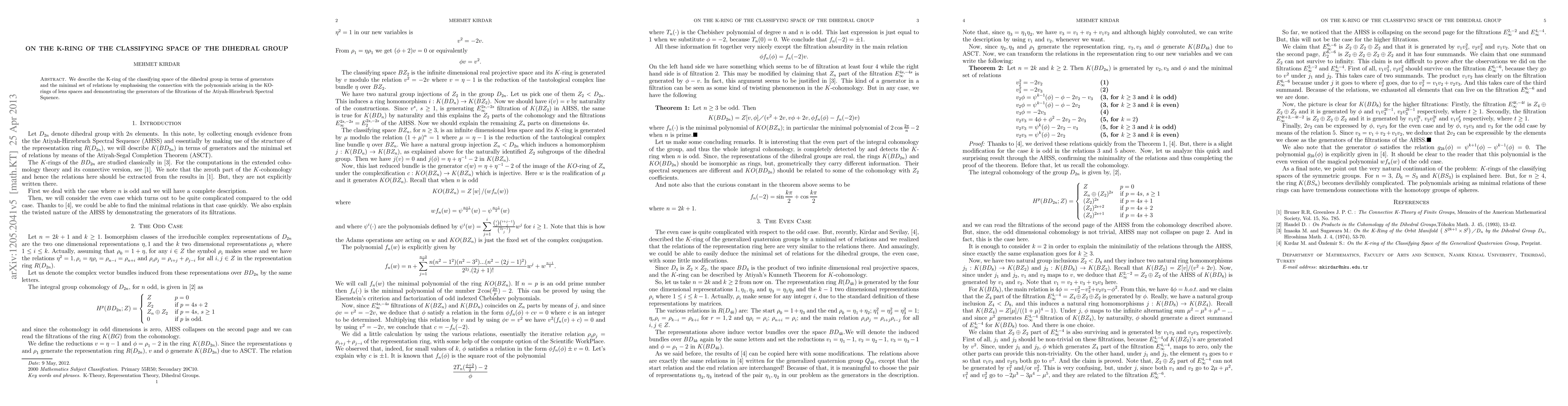 Researchers describe the K-ring of the classifying space of the dihedral group in terms of its generators and minimal relations, highlighting connections to lens spaces and Atiyah-Hirzebruch Spectral Sequence.