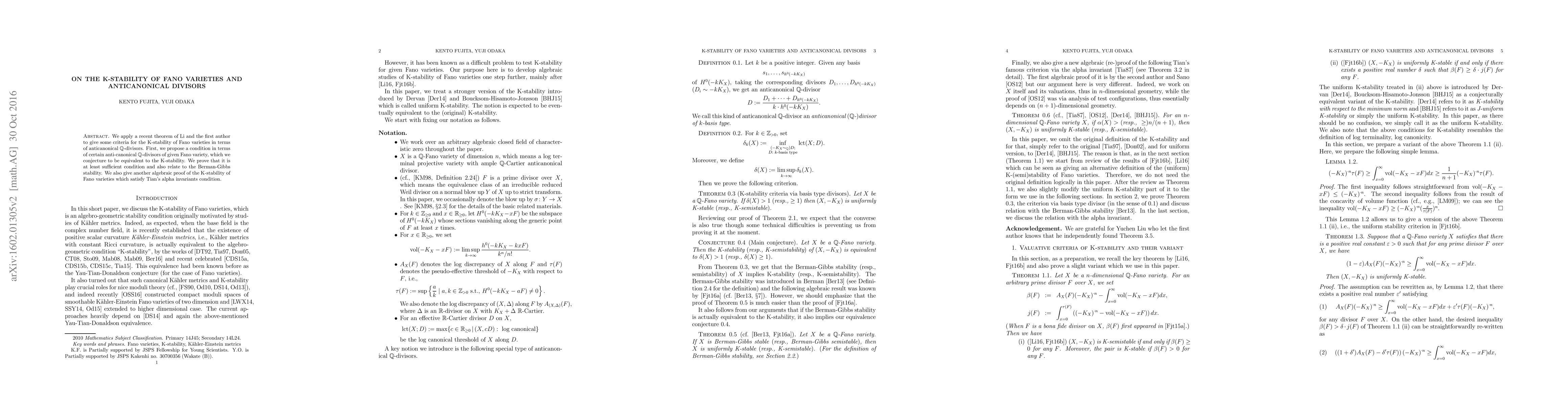 This paper proposes new criteria for K-stability of Fano varieties using anticanonical Q-divisors, proving that the proposed condition is a sufficient criterion and relates to Berman-Gibbs stability. It also provides an alternative proof for K-stability of Fano varieties meeting Tian's alpha invariants.