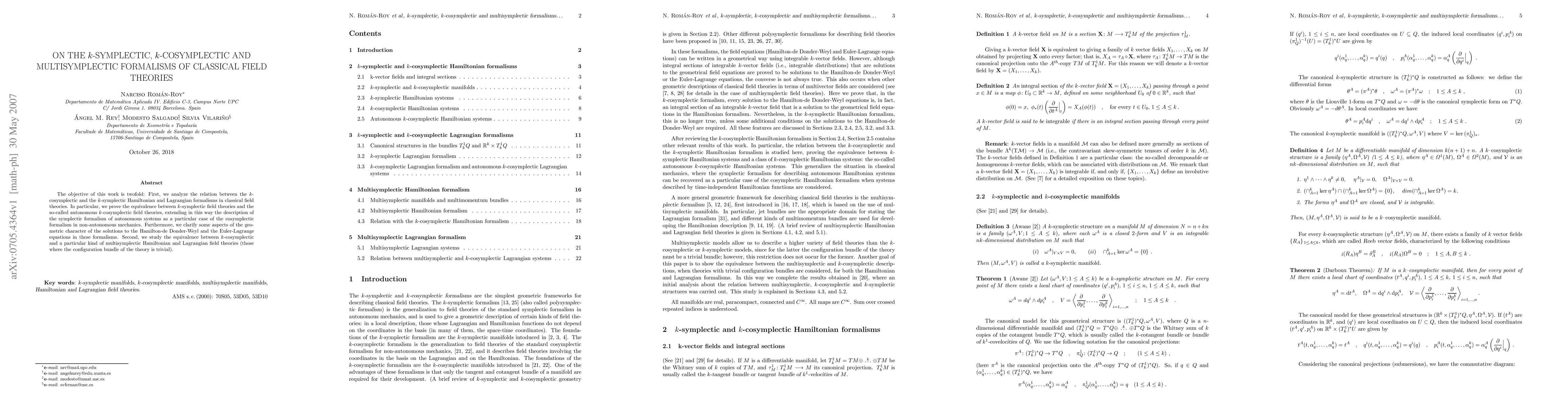 This paper explores the equivalence between k-symplectic and k-cosymplectic formalisms in classical field theories, proving that k-symplectic field theories are equivalent to autonomous k-cosymplectic field theories. It also investigates the relationship between k-cosymplectic and multisymplectic formalisms, particularly when the configuration bundle is trivial.