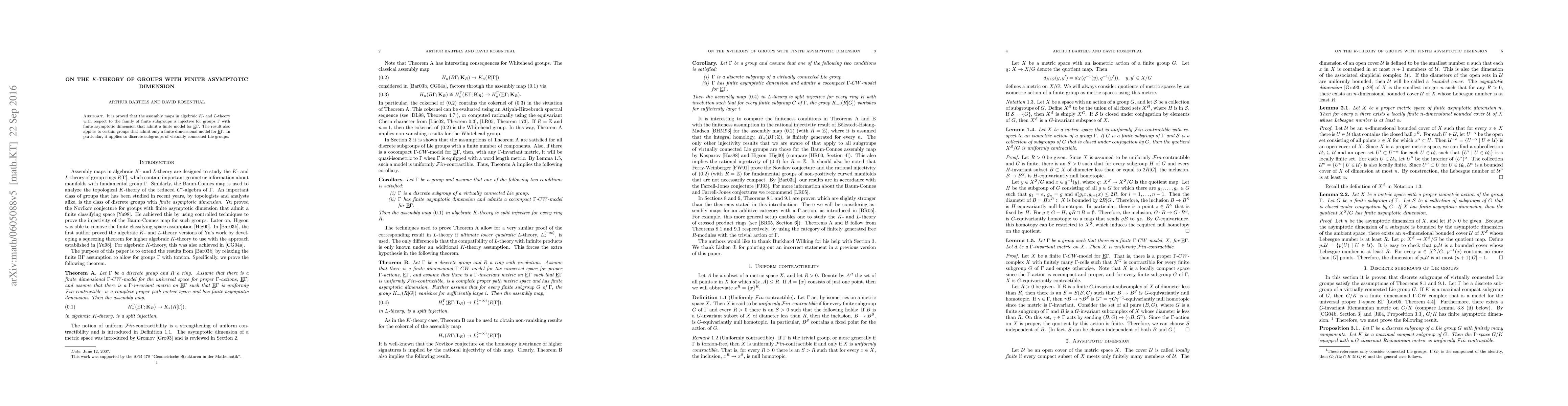 Researchers proved that assembly maps in K- and L-theory are injective for groups with finite asymptotic dimension and admit a finite model for their classifying space. This applies to discrete subgroups of virtually connected Lie groups.
