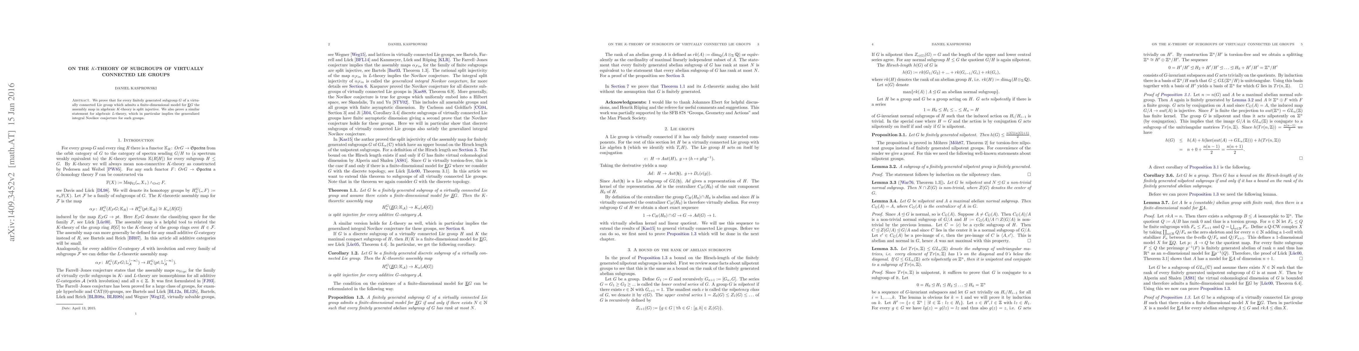 We prove that for every finitely generated subgroup of a virtually connected Lie group which admits a finite dimensional model for the classifying space for proper actions the assembly map in algebraic K-theory is split injective. We also prove a similar statement for algebraic L-theory, which in particular implies the integral Novikov conjecture for such groups.