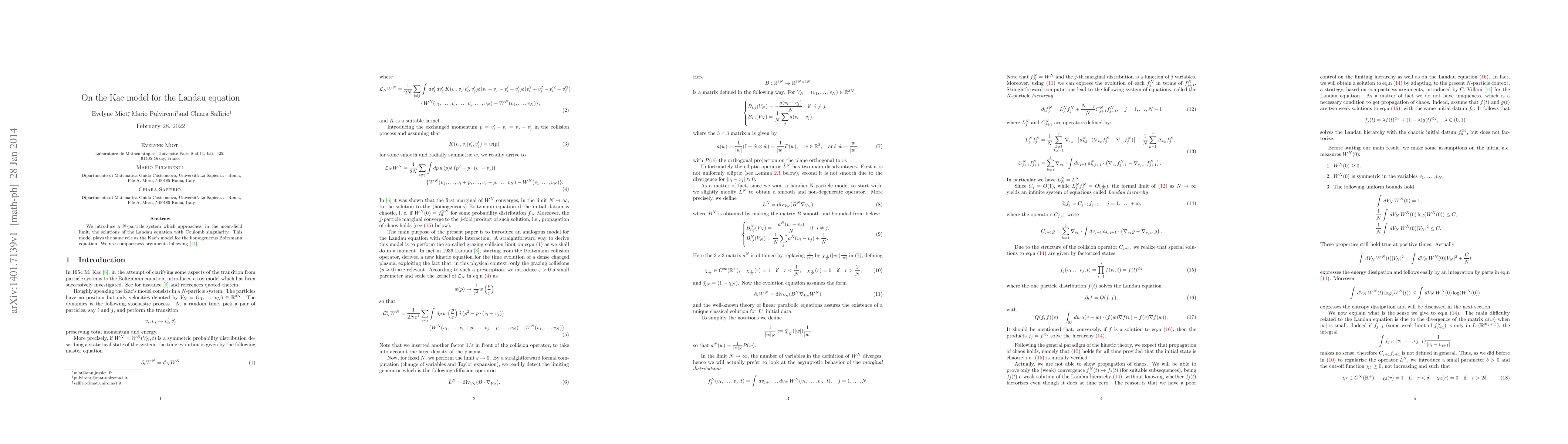 Researchers introduce a new model to study solutions of the Landau equation with Coulomb singularity, building on Kac's model for the homogeneous Boltzmann equation.