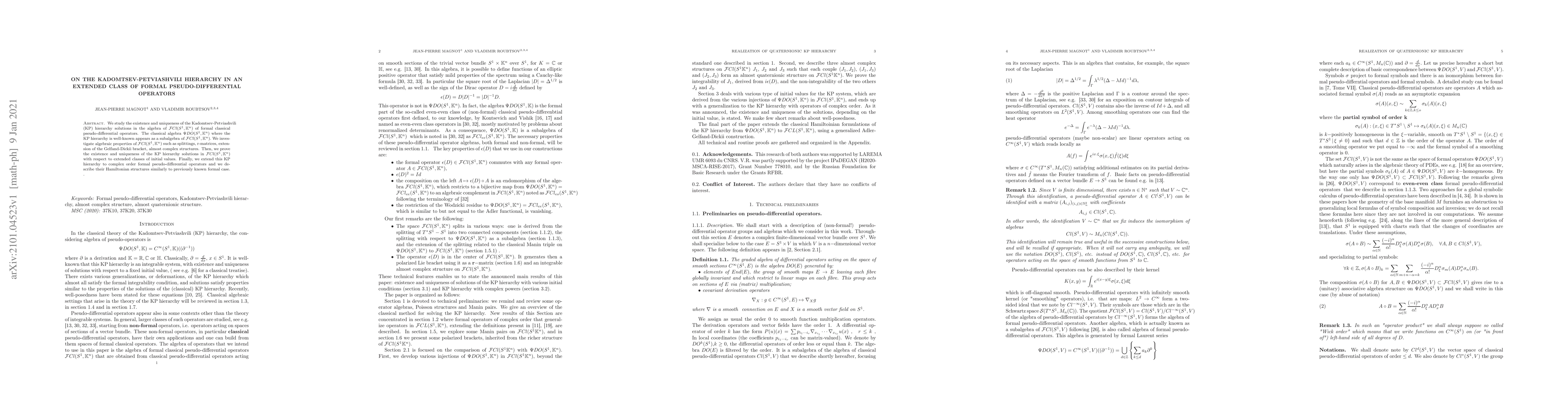 We study the existence and uniqueness of the Kadomtsev-Petviashvili (KP) hierarchy solutions in the algebra of $\F Cl(S^1,\K^n)$ of formal classical pseudo-differential operators. The classical algebra $\Psi DO(S^1,\K^n)$ where the KP hierarchy is well-known appears as a subalgebra of $\F Cl(S^1,\K^n).$ We investigate algebraic properties of $\F Cl(S^1,\K^n)$ such as splittings, r-matrices, extension of the Gelfand-Dickii bracket, almost complex structures. Then, we prove the existence and uniqueness of the KP hierarchy solutions in $\F Cl(S^1,\K^n)$ with respect to extended classes of initial values. Finally, we extend this KP hierarchy to complex order formal pseudo-differential operators and we describe their Hamiltonian structures similarly to previously known formal case.