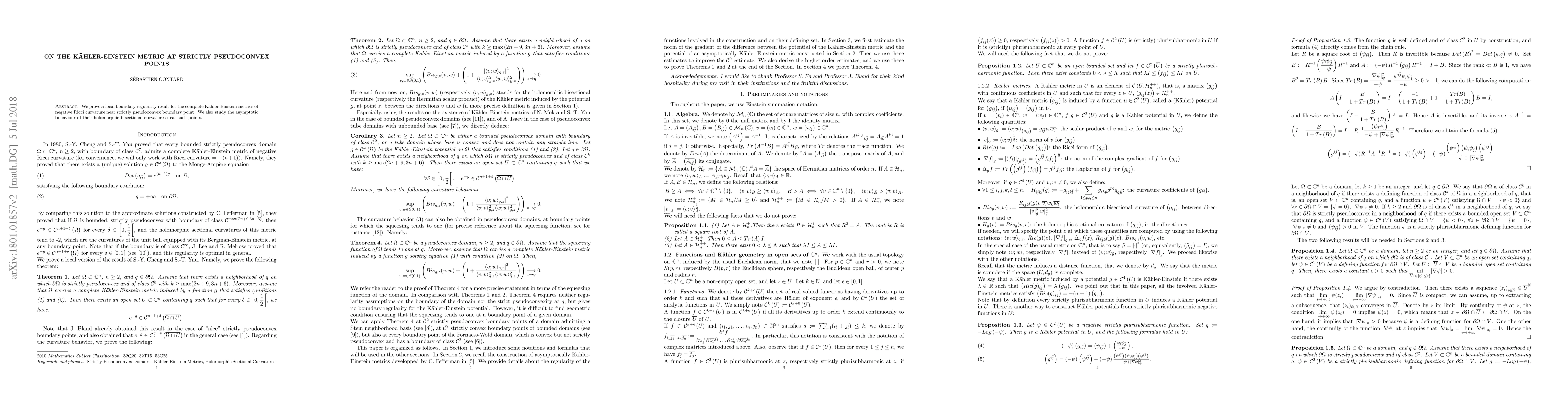 We prove a local boundary regularity result for the complete Kahler-Einstein metrics of negative Ricci curvature near strictly pseudoconvex boundary point. We also study the asymptotic behaviour of their holomorphic bisectional curvatures near such points.