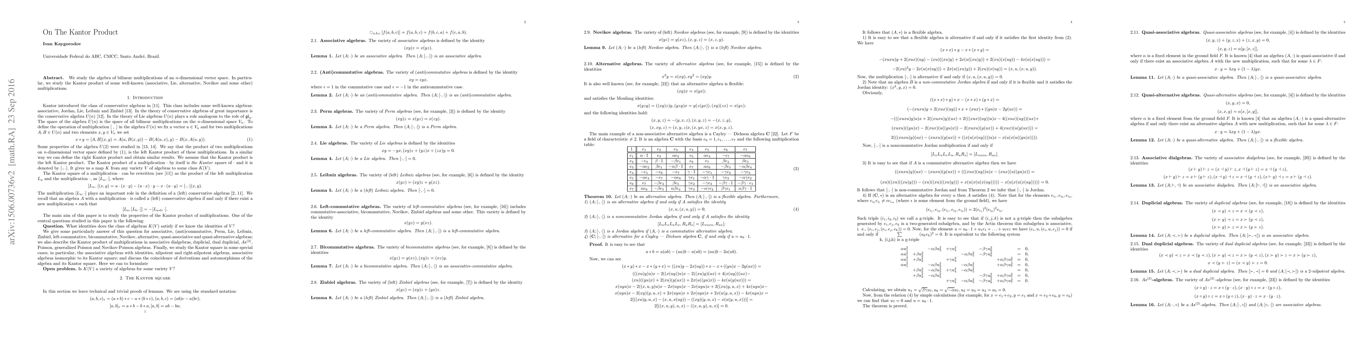 This paper investigates the algebra of bilinear multiplications in an $n$-dimensional vector space, focusing on the Kantor product applied to various known types of multiplications, including associative, Lie, alternative, and Novikov algebras.