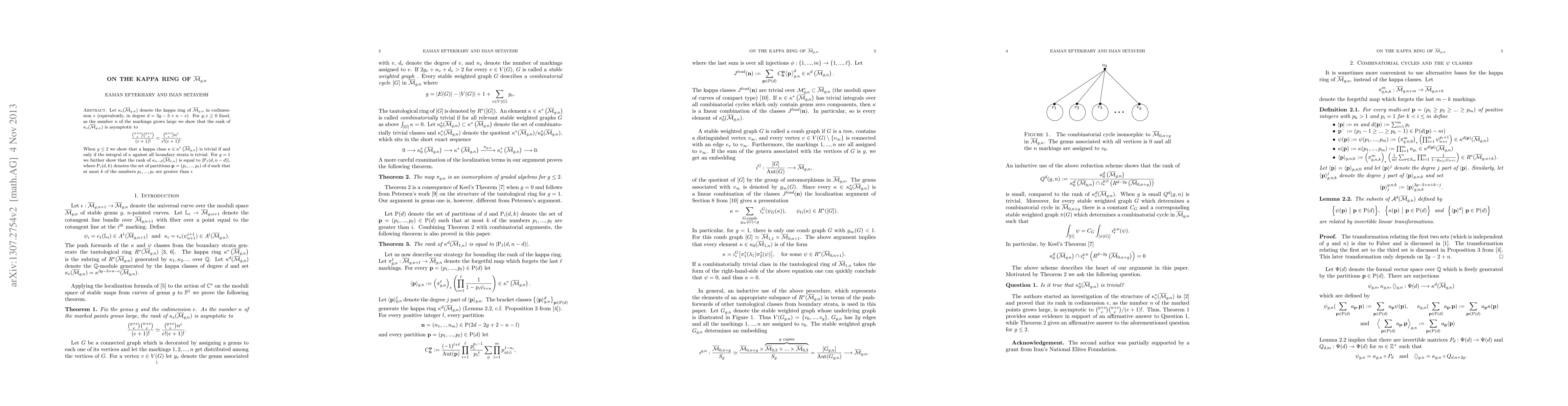 Let $\kappa_e(\overline{M}_{g,n})$ denote the kappa ring of $\overline{M}_{g,n}$ in codimension $e$. For $g,e\geq 0$ fixed, as the number $n$ of the markings grows large we show that the rank of $\kappa_e(\overline{M}_{g,n})$ is asymptotic to $$\frac{{n+e\choose e}{g+e\choose e}}{(e+1)!}\simeq \frac{{g+e\choose e}n^e}{e!(e+1)!}.$$ When $g\leq 2$ we show that a kappa class $\kappa$ is trivial if and only if the integral of $\kappa$ against all boundary strata is trivial. For $g=1$ we further show that the rank of $\kappa_{n-d}(\overline{M}_{1,n})$ is equal to $|P_1(d,n-d)|$, where $P_i(d,k)$ denotes the set of partitions $p=(p_1,...,p_\ell)$ of $d$ such that at most $k$ of the numbers $p_1,...,p_\ell$ are greater than $i$.