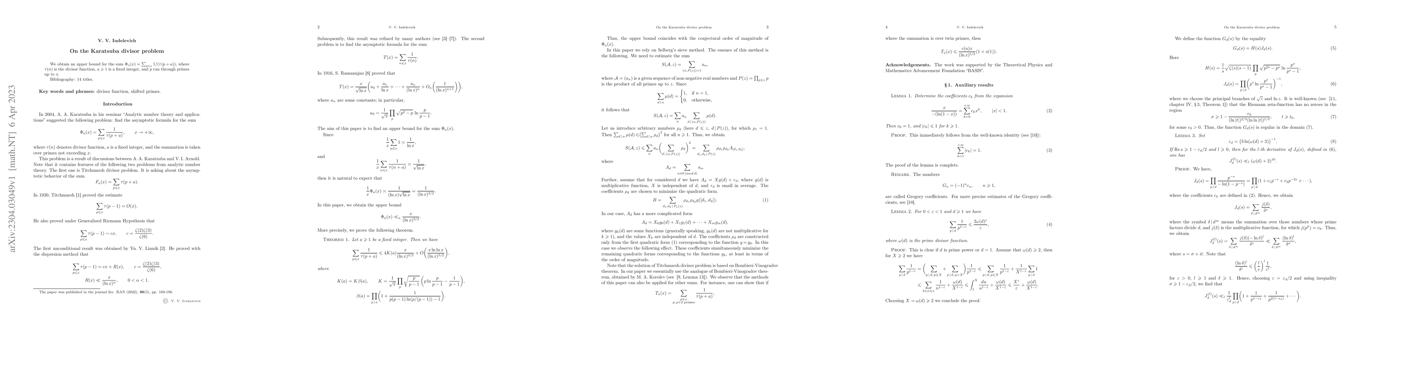 This paper provides an upper bound for the sum $\Phi_a(x) = \sum_{p\le x}1/(\tau(p+a))$, where $\tau(n)$ denotes the divisor function and $p$ runs through primes up to $x$. The result contributes to understanding the distribution of divisors in arithmetic progressions.