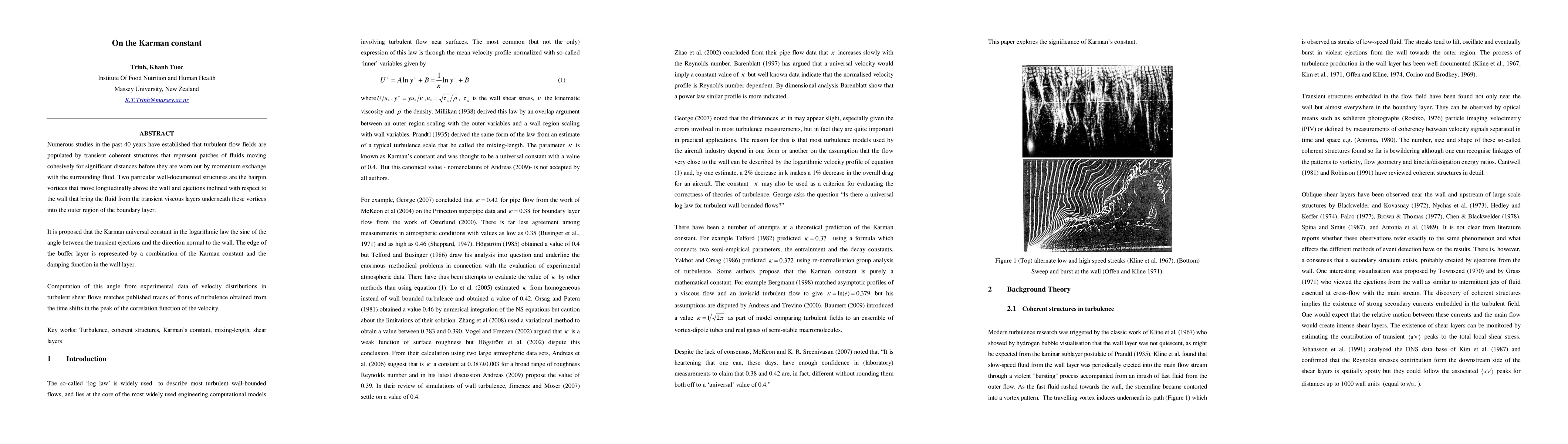 Numerous studies in the past 40 years have established that turbulent flow fields are populated by transient coherent structures that represent patches of fluids moving cohesively for significant distances before they are worn out by momentum exchange with the surrounding fluid. Two particular well-documented structures are the hairpin vortices that move longitudinally above the wall and ejections inclined with respect to the wall that bring the fluid from the transient viscous layers underneath these vortices into the outer region of the boundary layer. It is proposed that the Karman universal constant in the logarithmic law the sine of the angle between the transient ejections and the direction normal to the wall. The edge of the buffer layer is represented by a combination of the Karman constant and the damping function in the wall layer. Computation of this angle from experimental data of velocity distributions in turbulent shear flows matches published traces of fronts of turbulence obtained from the time shifts in the peak of the correlation function of the velocity. Key works: Turbulence, coherent structures, Karman constant, mixing-length, shear layers