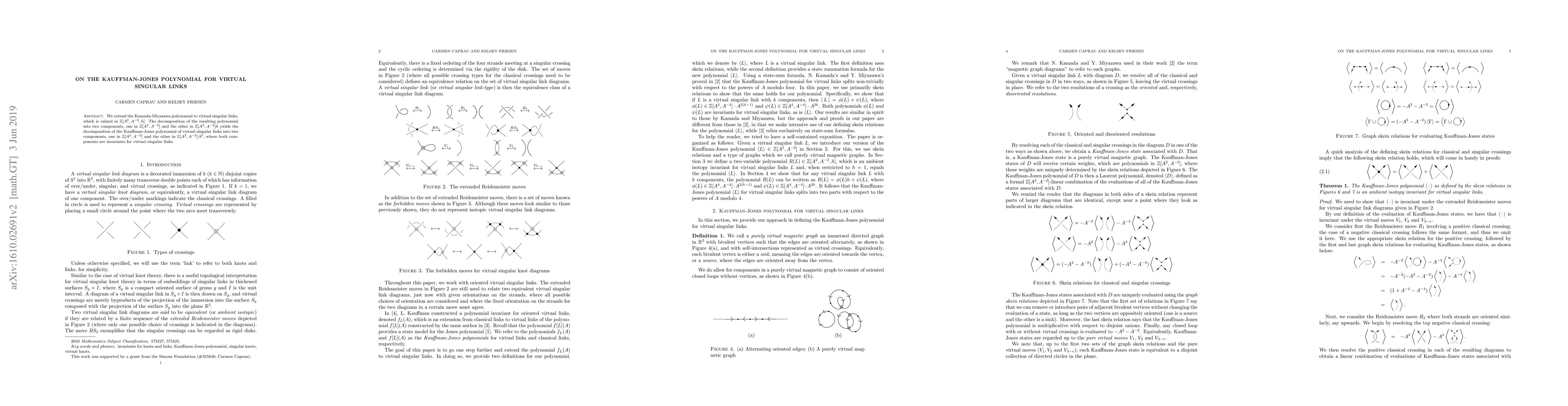 This paper extends the Kamada-Miyazawa polynomial to virtual singular links, yielding a polynomial decomposed into two components, which in turn decomposes the Kauffman-Jones polynomial into two invariant components for virtual singular links.