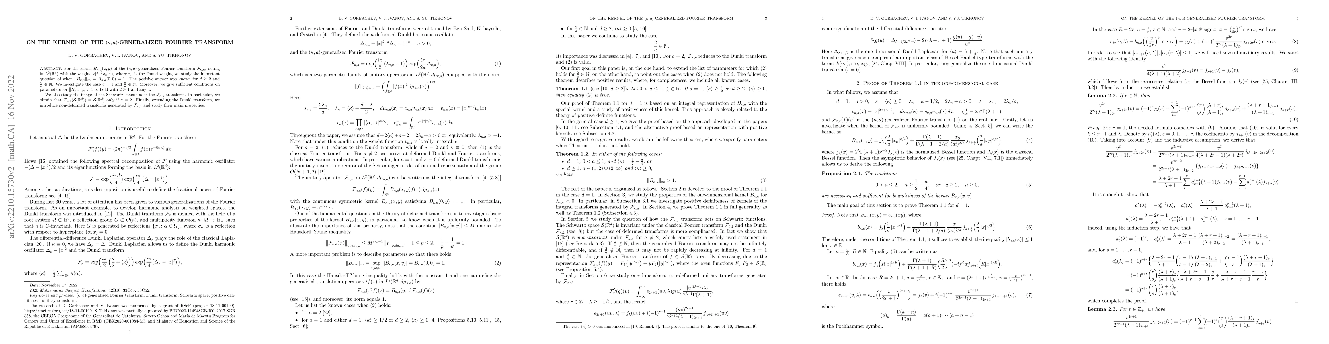 This paper investigates the kernel $B_{\kappa,a}(x,y)$ of the $(\kappa,a)$-generalized Fourier transform $\mathcal{F}_{\kappa,a}$ in $L^{2}(\mathbb{R}^{d})$, focusing on when $\|B_{\kappa,a}\|_{\infty}=B_{\kappa,a}(0,0)=1$. It extends previous results to $d=1$ and provides conditions for $\|B_{\kappa,a}\|_{\infty}>1$. Additionally, it examines the image of the Schwartz space under $\mathcal{F}_{\kappa,a}$ and introduces non-deformed transforms generated by $\mathcal{F}_{\kappa,a}$.