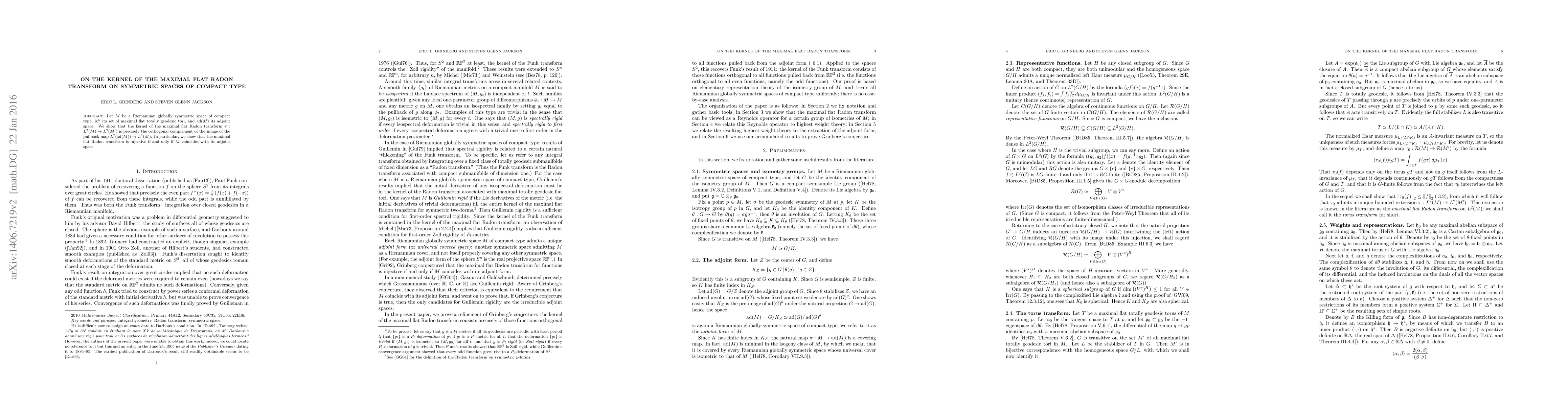 Let $M$ be a Riemannian globally symmetric space of compact type, $M'$ its set of maximal flat totally geodesic tori, and $\mathrm{ad}(M)$ its adjoint space. We show that the kernel of the maximal flat Radon transform $\tau:L^2(M) \rightarrow L^2(M')$ is precisely the orthogonal complement of the image of the pullback map $L^2(\mathrm{ad}(M))\rightarrow L^2(M)$. In particular, we show that the maximal flat Radon transform is injective if and only if $M$ coincides with its adjoint space.